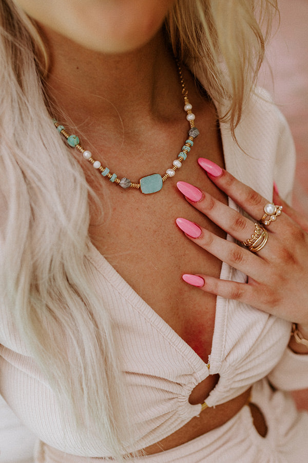 You are sure to be a trend maker when you accessorize with this adorable necklace featuring a short turquoise, gold, and pearl beaded chain!