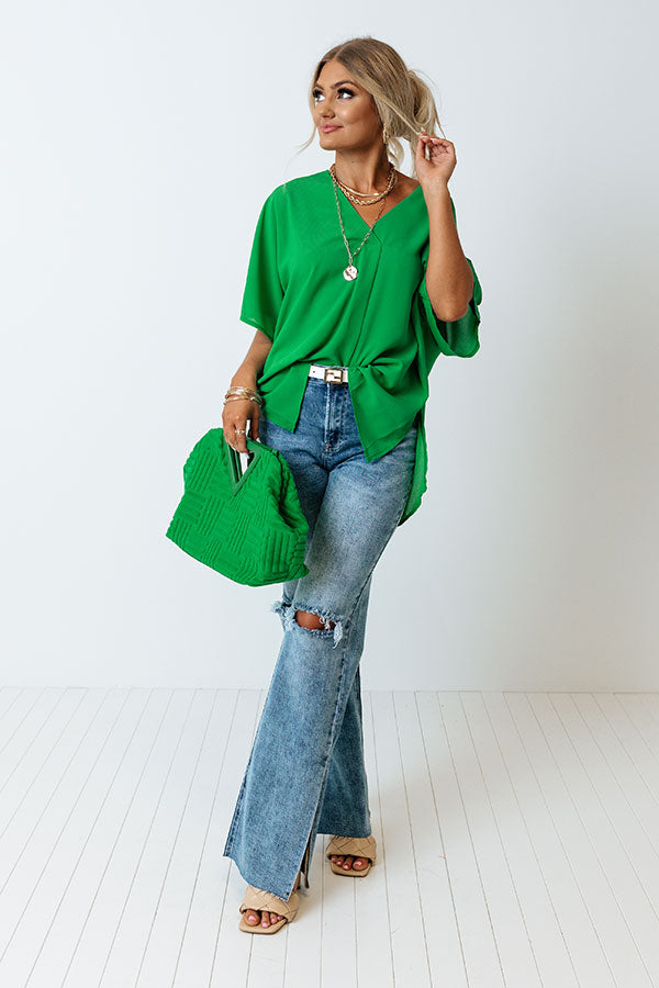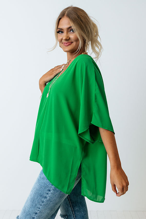 You will be one trendy girl this summer when you complete your look with this casual cute kelly green shift top featuring lightweight material, a v-cut neckline, oversized short sleeves, and a slouched silhouette that ends in a straight hemline with accent side slits!