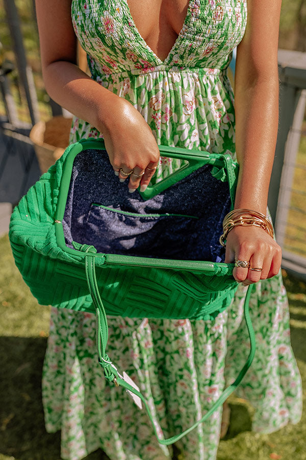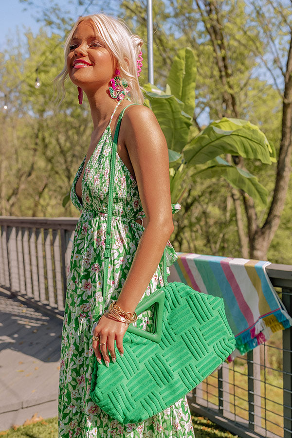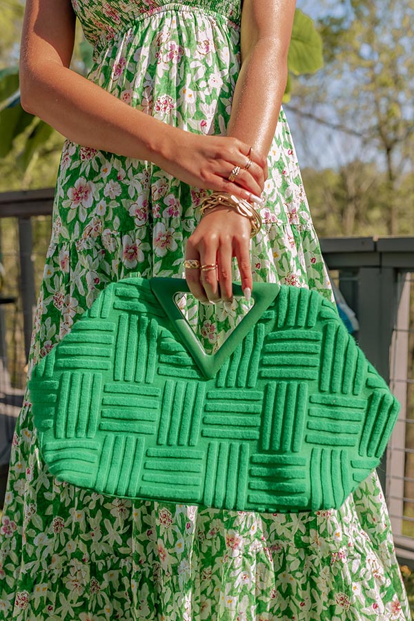 Stay on trend by completing your look with this unique green tote featuring soft terry cloth texturing, two built in triangle tote handles, a removable and adjustable shoulder strap, and a spacious fully lined pouch silhouette with an additional inside pocket!