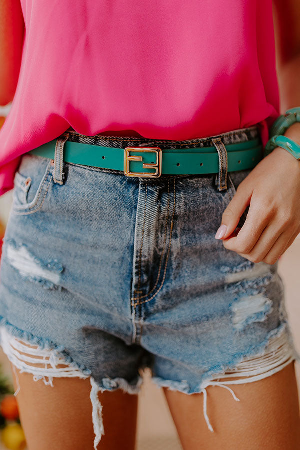 You will be one trendy girl when you complete your look with this dainty teal colored belt featuring a skinny faux leather and and a gold rectangular buckle!