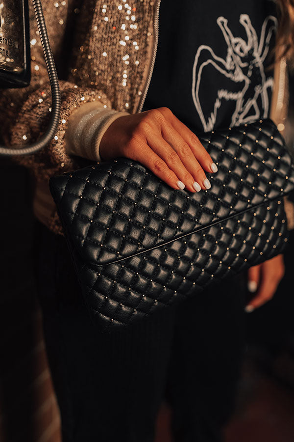 You will undoubtedly look "trendy in the city" when you accessorize with this black clutch featuring a quilted faux suede texture with gold accents, a flap closure with two button snaps, a spacious fully lined inner pocket with an additional pouch, and a removable chain link crossbody strap!