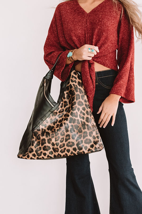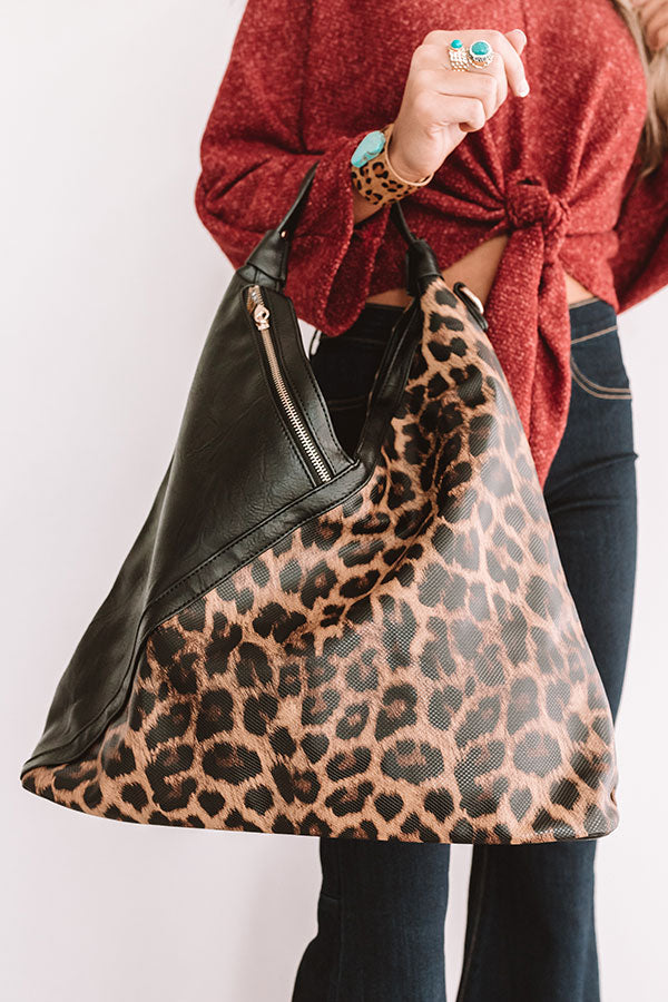 This black tote is a true treasure with its sleek faux leather material with a bold brown leopard print, an asymmetrical shape, a wide handle, a removable shoulder strap, and a spacious fully lined pouch with a zip closure and additional inner pockets!