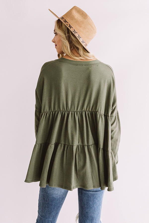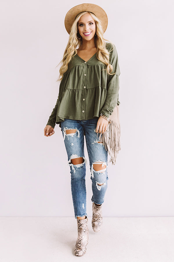 This olive colored shift top is a true treasure with its lightweight material, bunched fabric detailing, v-cut neckline, long loose sleeves, button up bodice, and ultra relaxed tiered silhouette that falls into a rounded hemline! We have styled this casual fall piece with some distressed ankle skinnies, snake print booties, and a neutral faux suede hat and fringe crossbody, but you can also wear it under our "Roasting Marshmallows Vest in Taupe" with some charcoal flares and "The Seraphina Faux Leather Wedge in Taupe!" Measurements
