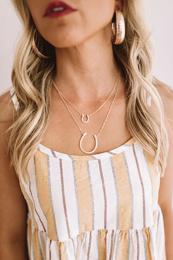 You heard it here first...it's "tried and true" that this rose gold necklace is one of our summer faves featuring two layered chains adorned with a large and a small horse shoe charm!