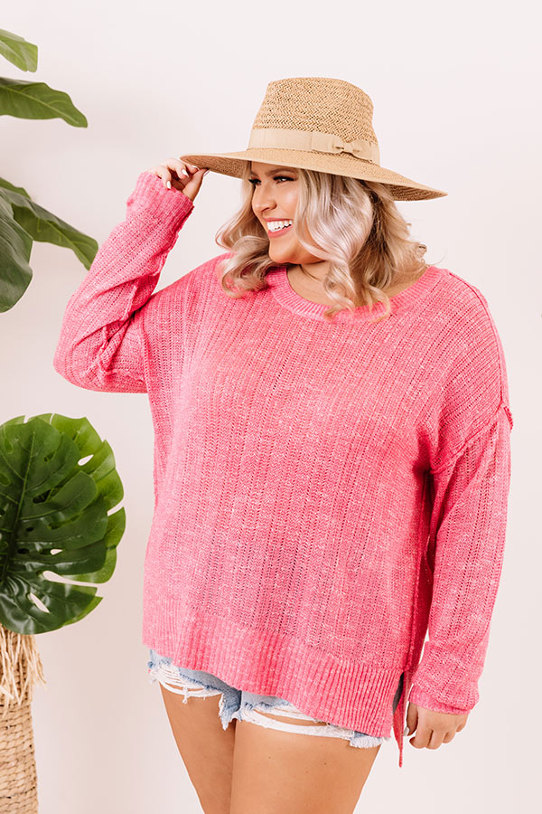 Plus Size - Stay warm on those cool summer desert nights in our adorable pink 'Trip To Flagstaff' sweater featuring soft lightweight loose knit material, a high rounded neckline, long loose sleeves, exposed seam detailing, and a slouched silhouette that falls into a straight tunic-length hemline with accent side slits! Measurements