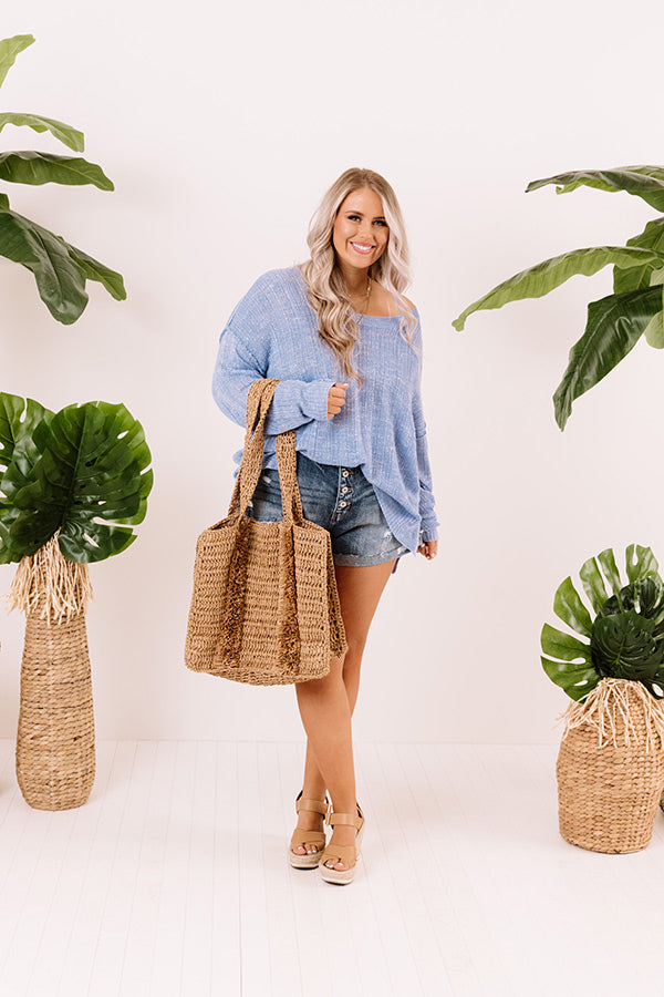 Plus Size - Stay warm on those cool summer desert nights in our adorable sky blue 'Trip To Flagstaff' sweater featuring soft lightweight loose knit material, a high rounded neckline, long loose sleeves, exposed seam detailing, and a slouched silhouette that falls into a straight tunic-length hemline with accent side slits! Measurements