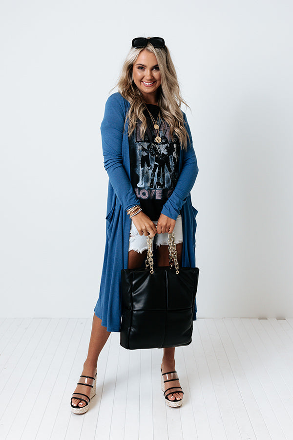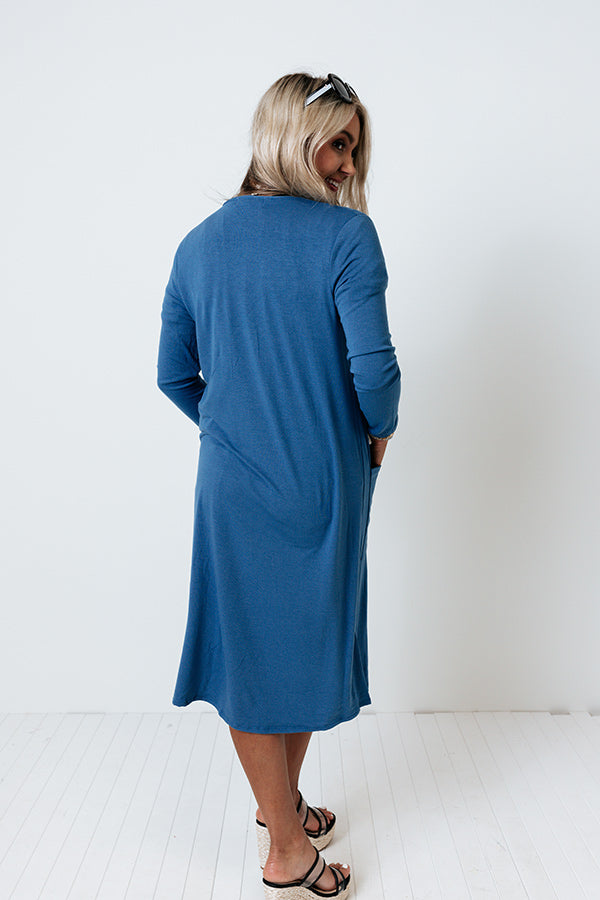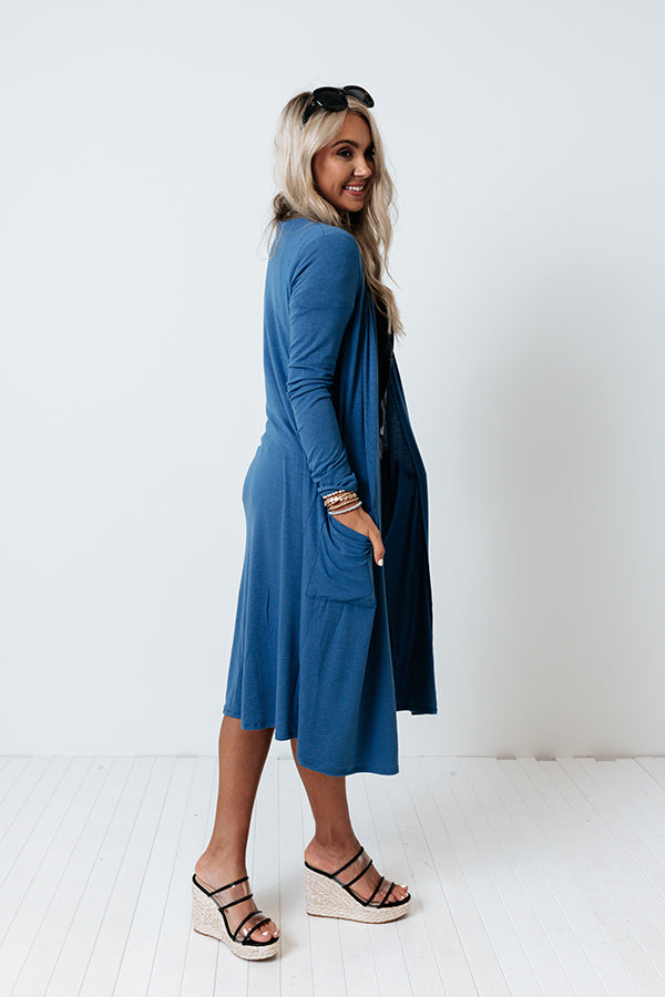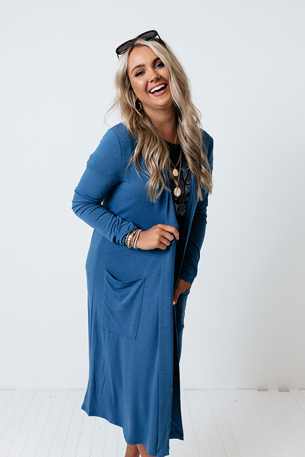 Layer up in style with our adorable blue 'Triple Threat Cardigan' featuring soft lightweight material, long loose sleeves, low accent pockets, and a draped open front silhouette that cascades into a straight mid-calf length hemline! Measurements