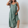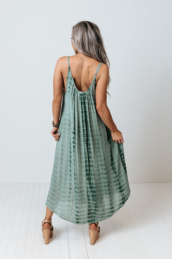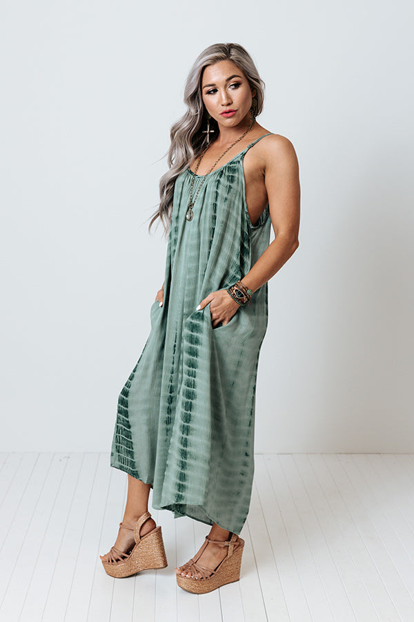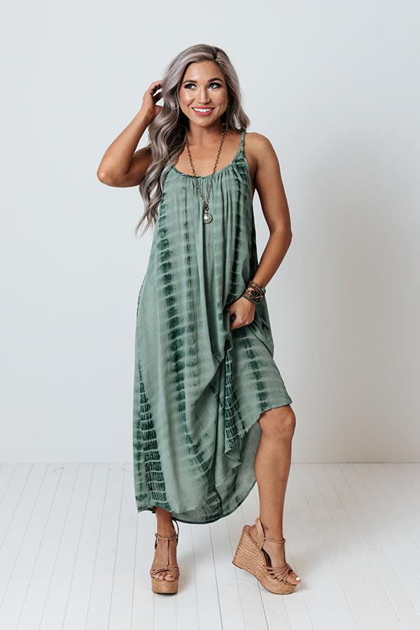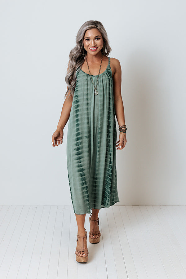 Breeze into summer effortlessly with this pretty sage hued midi dress featuring lightweight flowy material patterned with dark green tie dye, a scooped neckline and upper back with adjustable spaghettis traps, hidden side pockets, and an ultra draped silhouette that cascades into a rounded mid-calf length hemline!