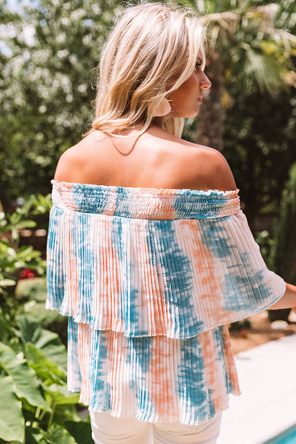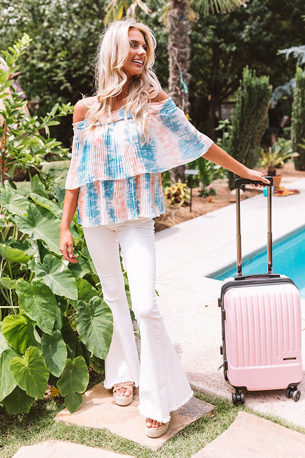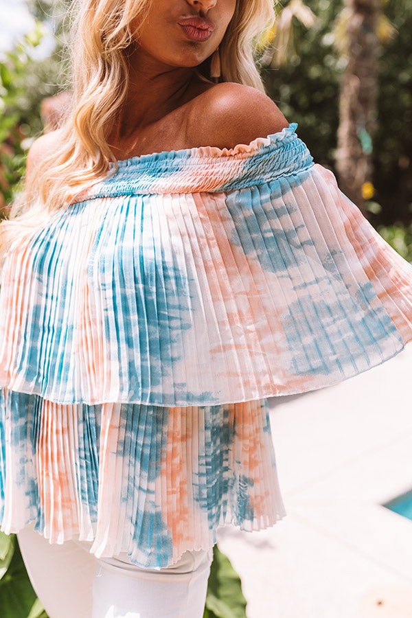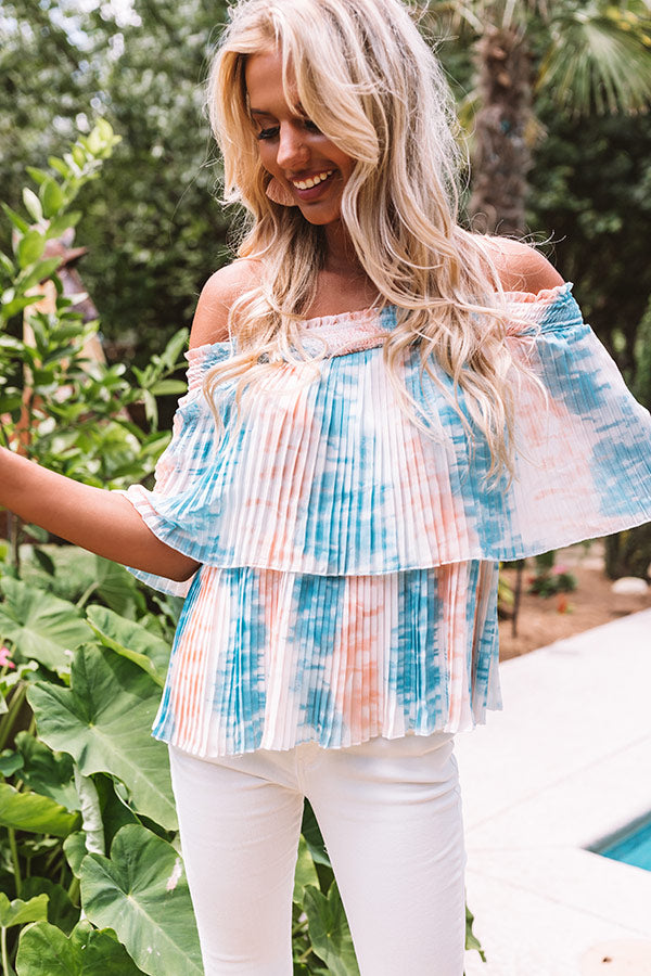 Live life colorfully in our dainty "Tropical Coast" top featuring ultra lightweight pleated material patterned with blue and orange hued tie dye, an off-the shoulder fit with smocked detailing, a straight neckline with ruffled accent trim, an overlaid bodice with drop sleeves, and a relaxed silhouette that falls into an uneven silhouette! We have styled this vibrant cutie with some white flares and neutral espadrilles, but you can also wear it with some distressed denim shorts, "The Bowen Wedge in Blue," our "Costa Kisses Woven Tote," and our "South West Scenery Hat!"