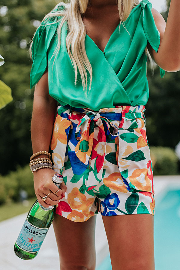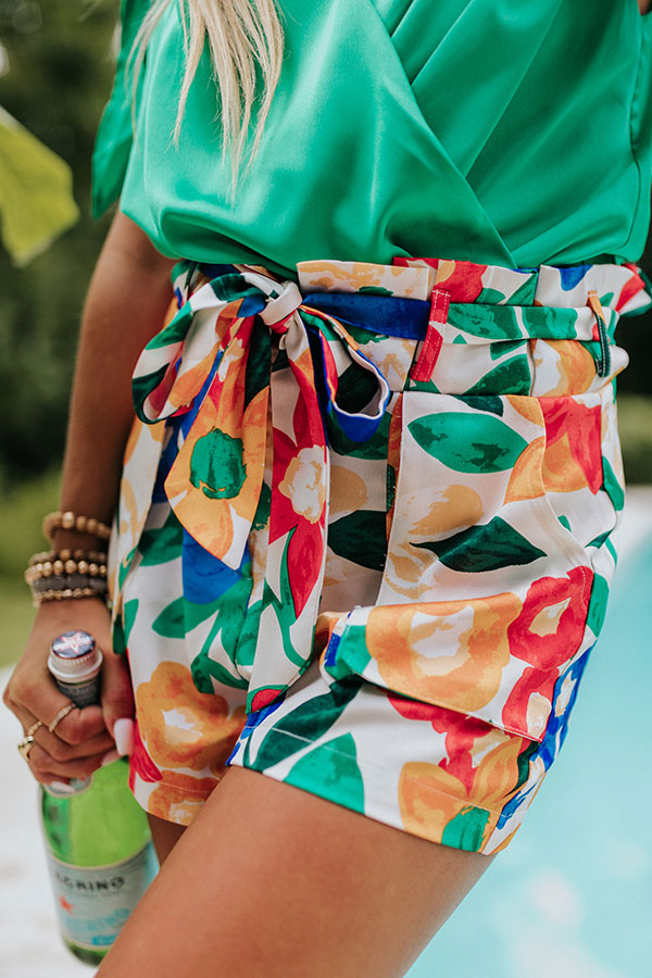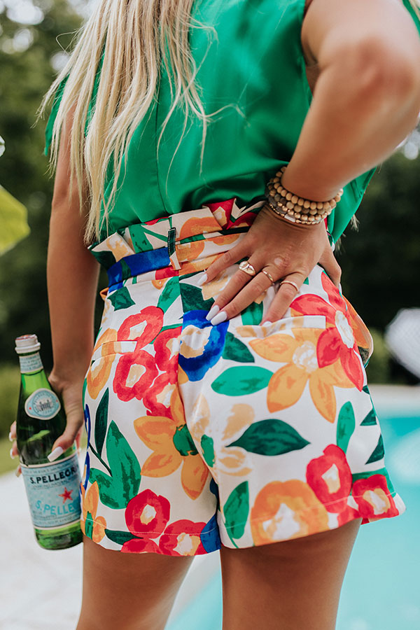 Mix up your summer style with these photo worthy shorts featuring lightweight and flowy material patterned with a vibrant tropical floral print, a high pleated waistline with a tie belt, accent side pockets, and a flattering silhouette that ends in straight upper-thigh length hemlines! Measurements