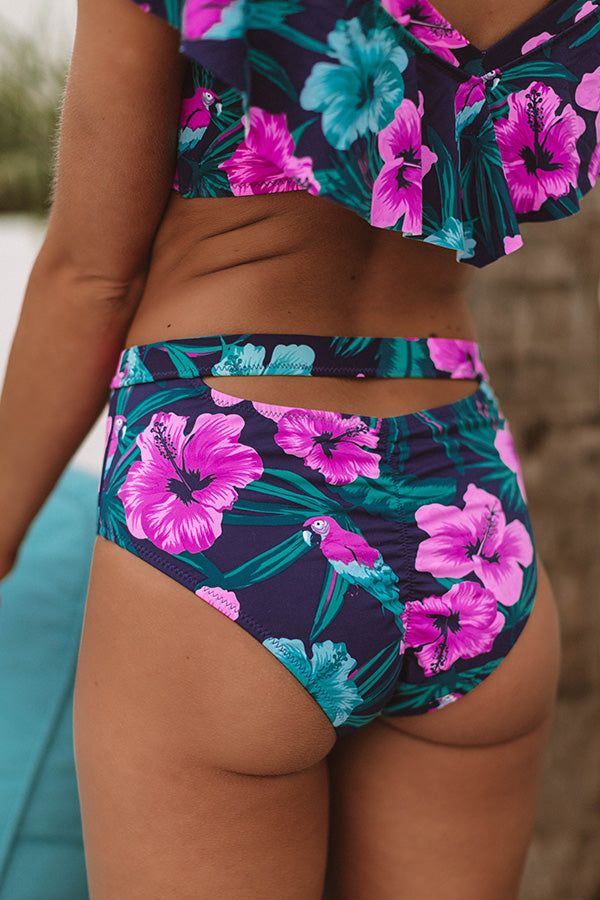 This playful printed one piece is sure to steal the show wherever you go! It has a flirty ruffle accented top with built in molded cups that shape and add support, a chic slimming silhouette with sexy cut out sides, and a flattering high-waisted ruched bottom with the perfect cheeky coverage!