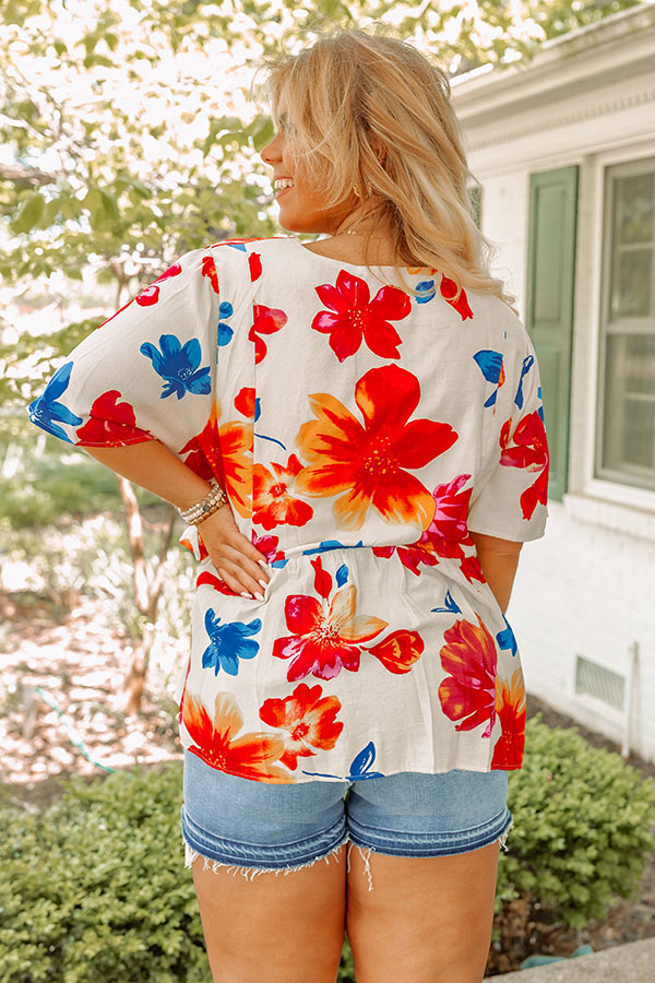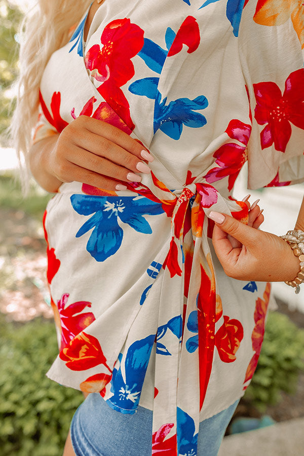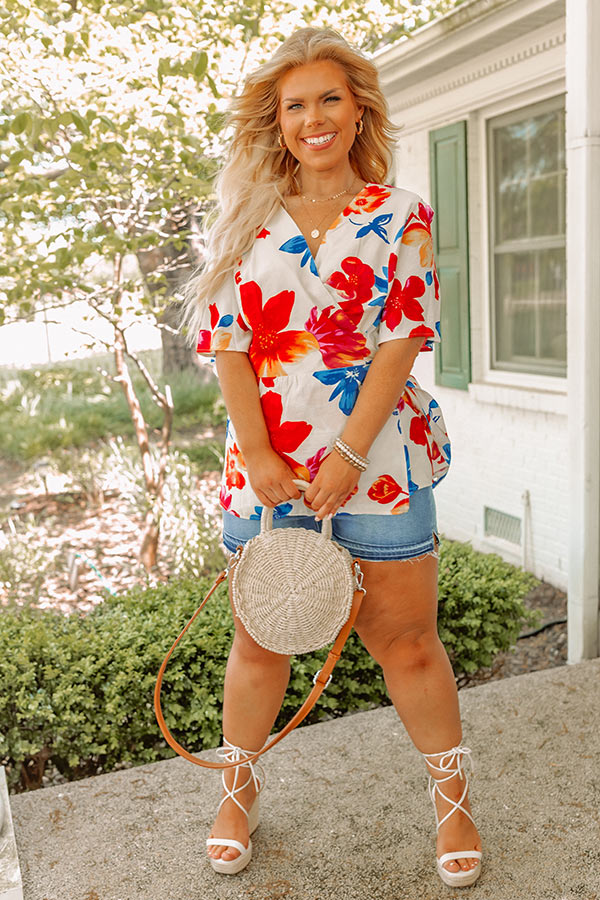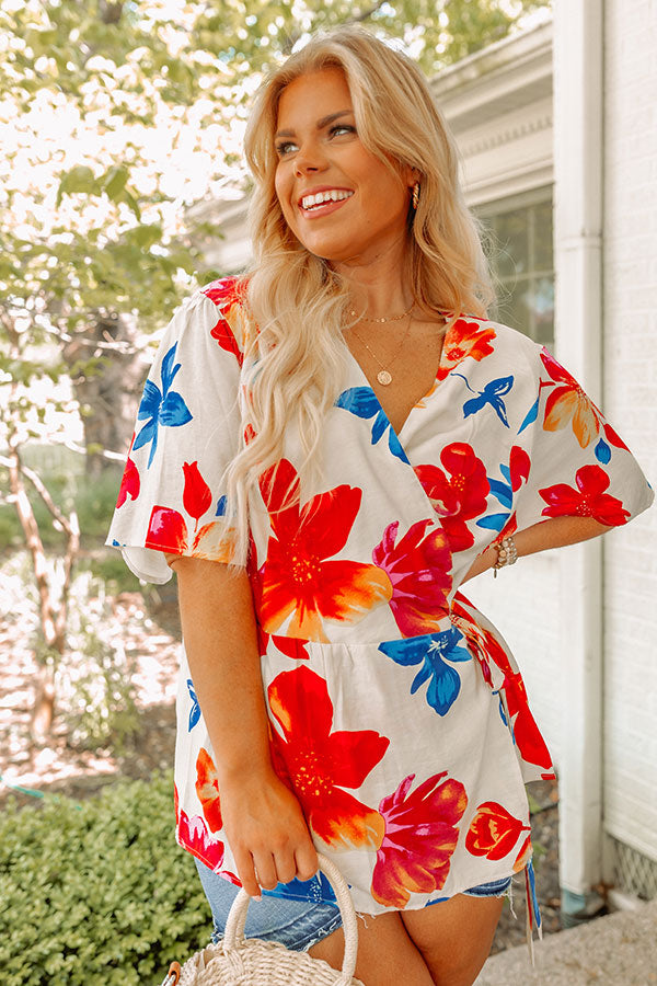 Get summer ready in our pretty white plus size 'Tropical Trip' top featuring lightweight material patterned with a red and royal blue floral print, a wrap bodice with a side tie closure and v-cut neckline, short loose sleeves, and a flattering silhouette that ends in a straight hemline!