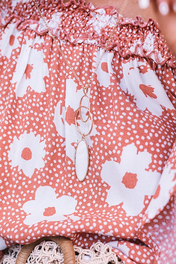 Make a statement with our darling "True Miracle Necklace" featuring a long dainty chain with two interlocking gold hoops and a white oval pendant!