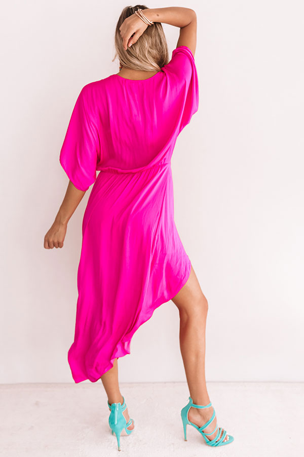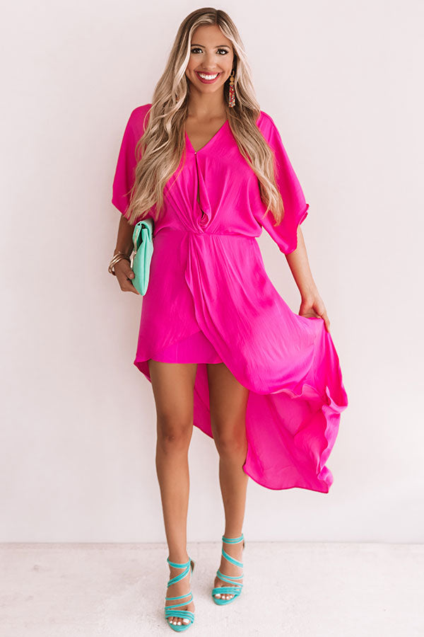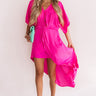 This truly romantic hot pink dress features a daring deep v-neck with a snap closure, a belt tie, loose sleeves, and a high-low hem with a black slip! We love how the silky fabric of this dress can be styled many different ways, like with colored accents, or with more neutral pieces like our "Kris Lace Up Heel in Stone" and "Viva Vacay Clutch in Stone!" Measurements