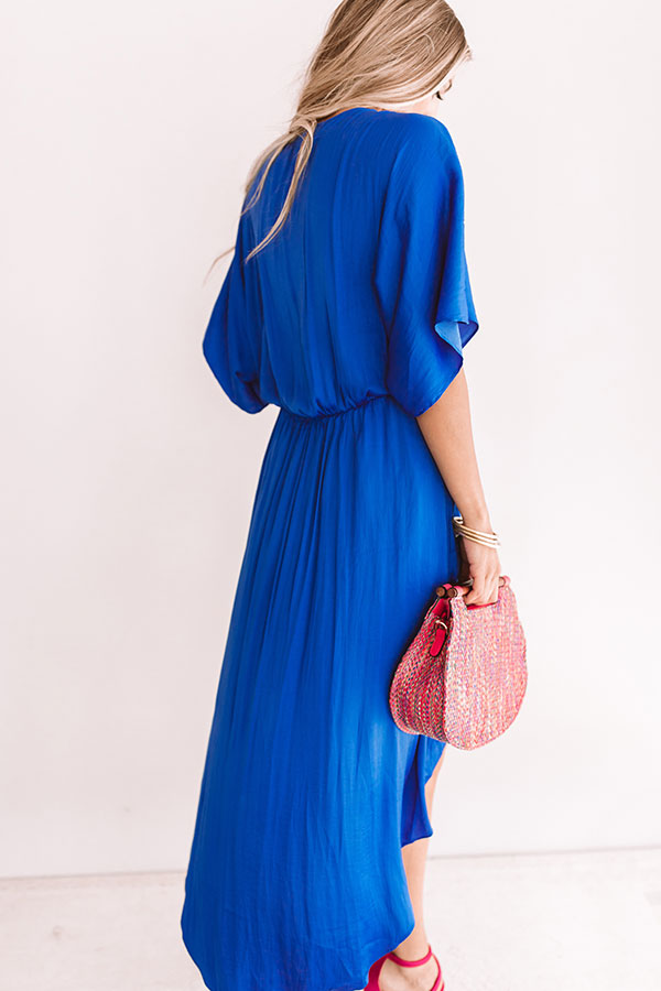 This truly romantic royal blue dress features a daring deep v-neck with a snap closure, a belt tie, loose sleeves, and a high-low hem with a black slip! We love how the silky fabric of this dress can be styled many different ways, like with red accents, or with snake print pieces like our "Kennedy Wedge in Snake Print" and "After Hours Snake Print Clutch!" Measurements