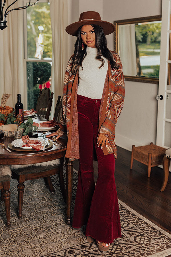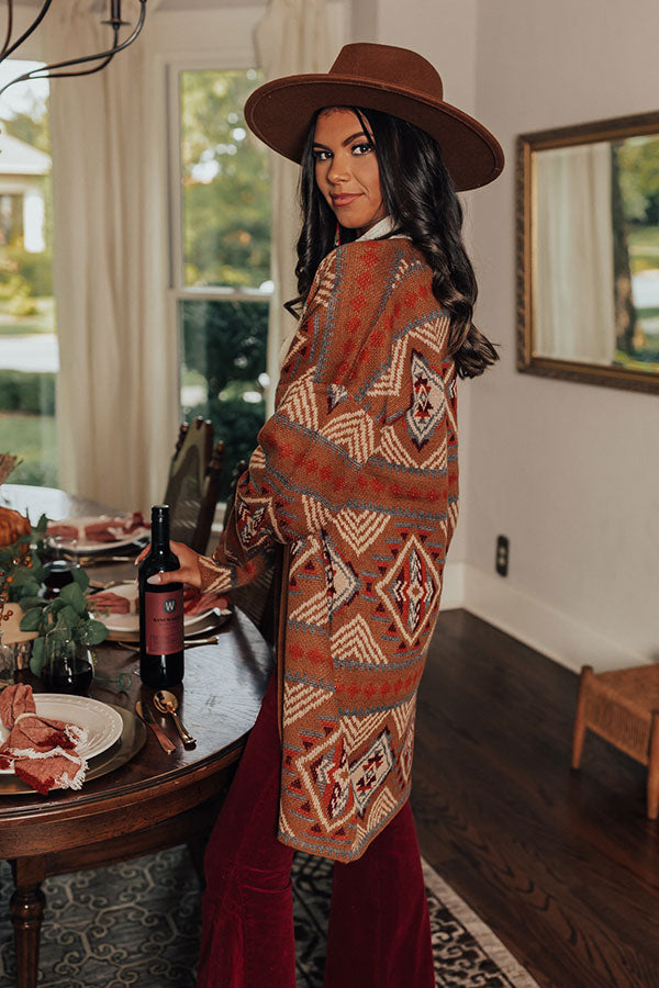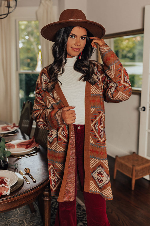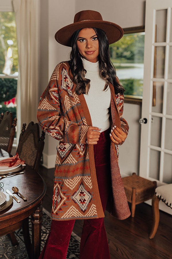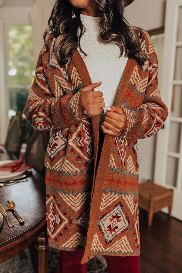 Effortlessly layered up in 'True Warmth Cardigan' featuring a soft knit material with vibrant aztec prints, an open front, and a draped silhouette that falls into a straight lower-thigh length hemline!