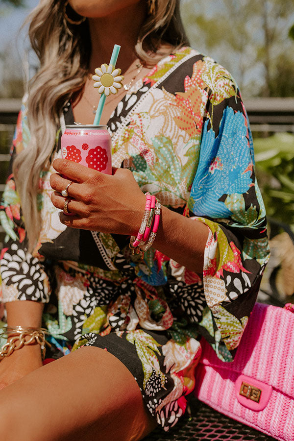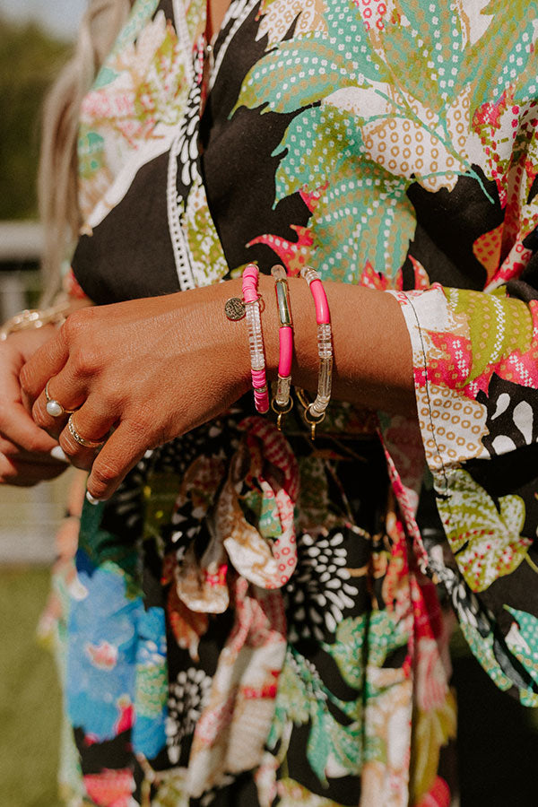 Add a truly chic finish to any look with this luxe bracelet set featuring three hot pink, clear, and gold flake resin stretch bands! Due to manufacturing there may be variations in the bracelets, no two are alike.