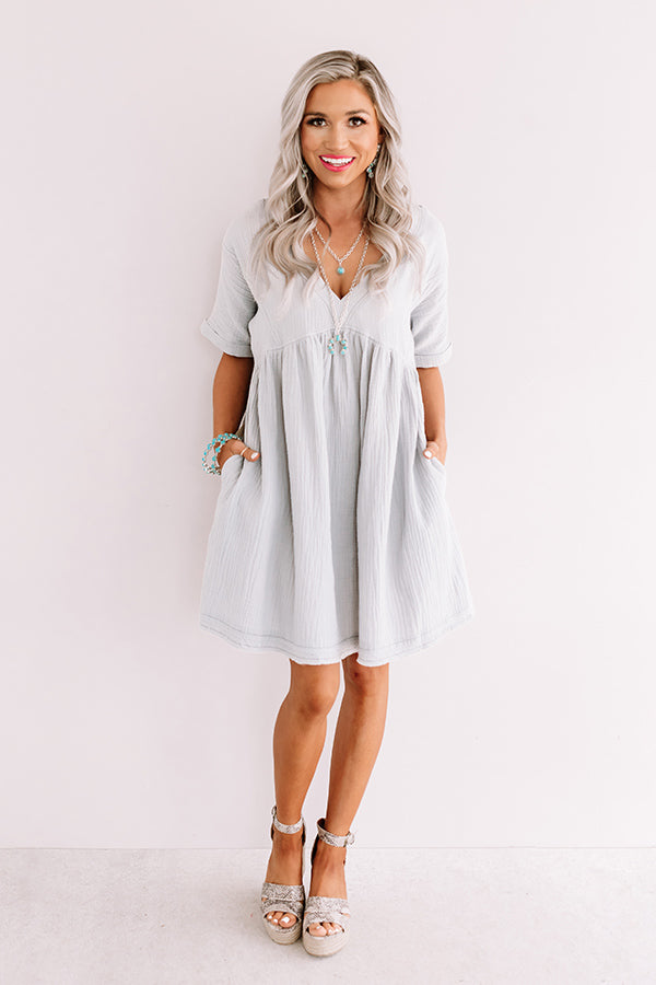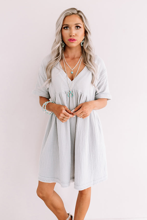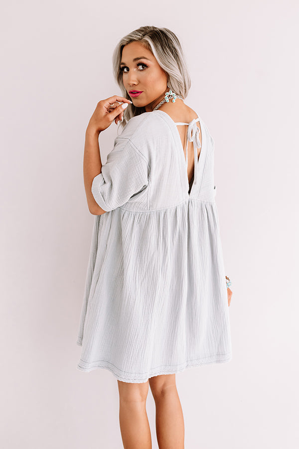 We know it's "truly tempting" to add this adorable airy blue babydoll dress to your cart...so go ahead! It features soft lightweight material with subtle texturing, a deep v-cut neckline and upper back with a tie closure, loose half sleeves, and an ultra relaxed babydoll silhouette that falls into a straight mid-thigh length hemline! This cutie styles perfectly with some turquoise statement jewelry and snake print block heels, but you can also wear it with "The Portia Faux Leather Peep Toe Bootie in Stone," our "Plans In Paris Wool Hat in Cream," and our "City Chic Faux Leather Tote in Stone!" Measurements