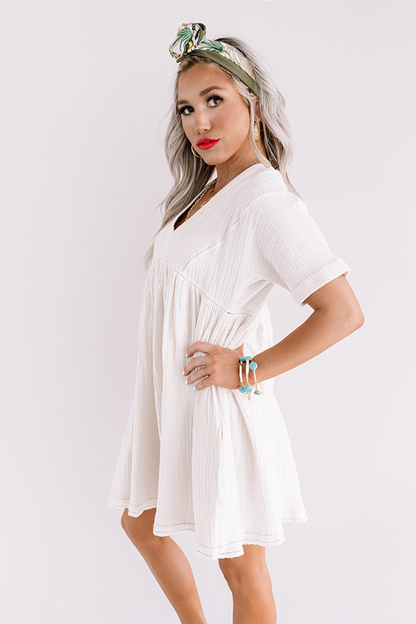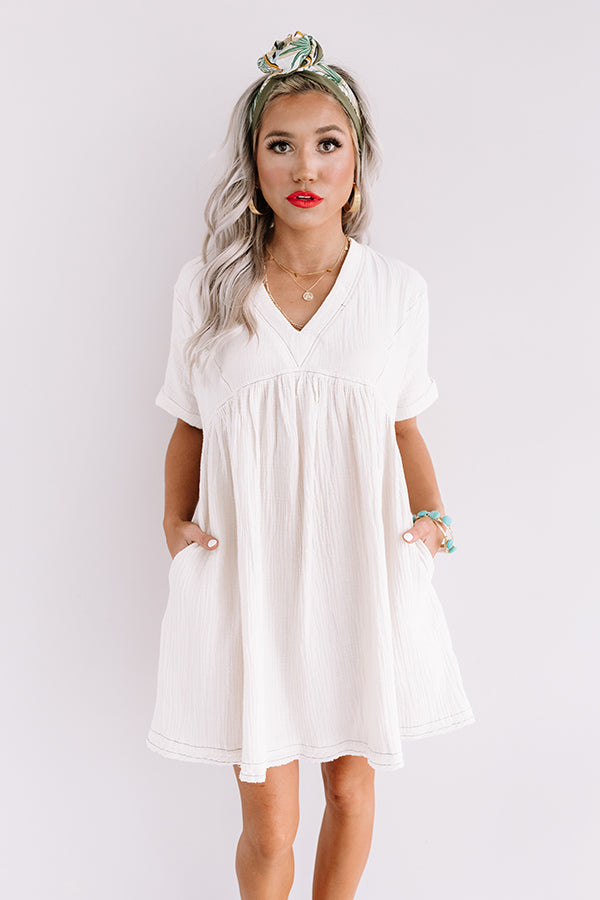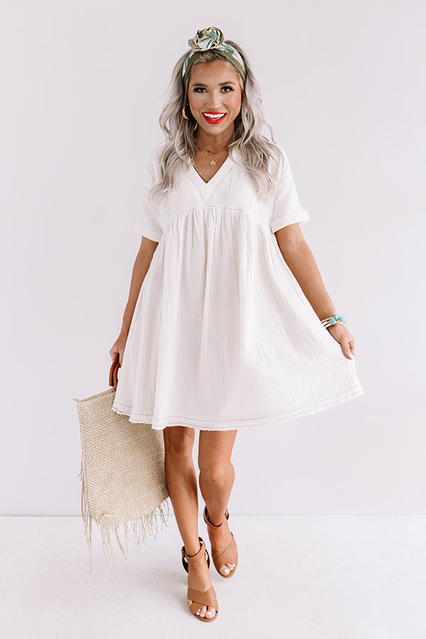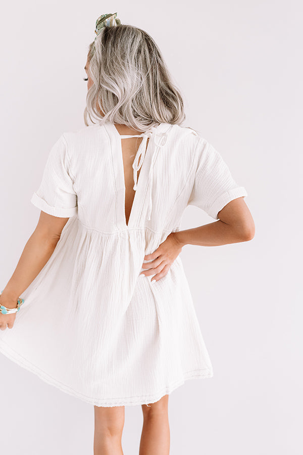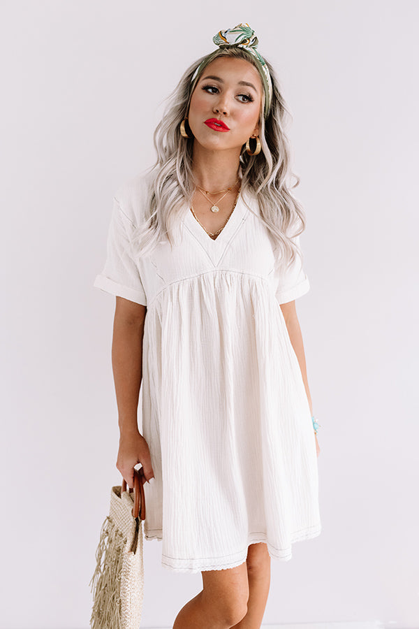 We know it's "truly tempting" to add this adorable ivory colored babydoll dress to your cart...so go ahead! It features soft lightweight material with subtle texturing, a deep v-cut neckline and upper back with a tie closure, loose half sleeves, and an ultra relaxed babydoll silhouette that falls into a straight mid-thigh length hemline! This cutie styles perfectly with some turquoise statement jewelry and snake print block heels, but you can also wear it with "The Portia Faux Leather Peep Toe Bootie in Stone," our "Plans In Paris Wool Hat in Cream," and our "City Chic Faux Leather Tote in Stone!" Measurements