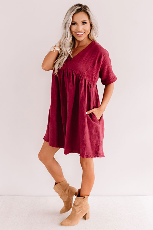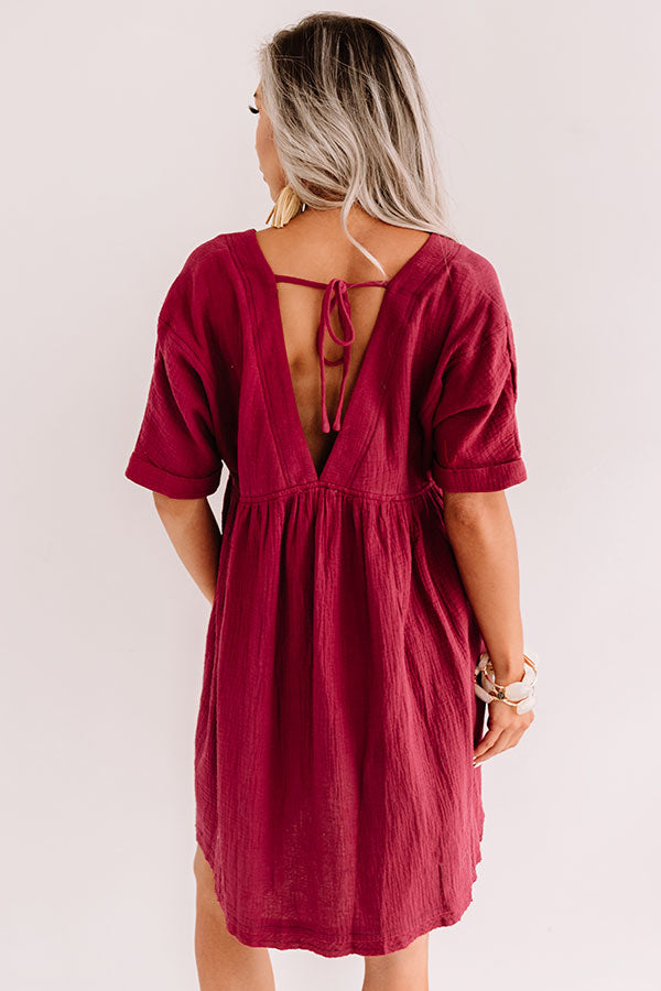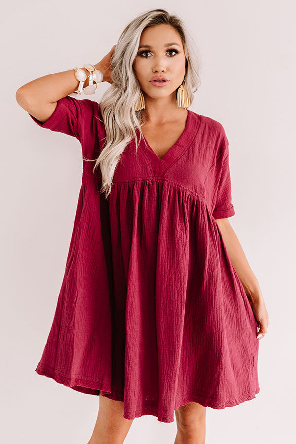 We know it's "truly tempting" to add this adorable wine colored dress to your cart...so go ahead! It features soft lightweight material with subtle texturing, a deep v-cut neckline and upper back with a tie closure, loose half sleeves, and an ultra relaxed babydoll silhouette that falls into a straight mid-thigh length hemline! Measurements