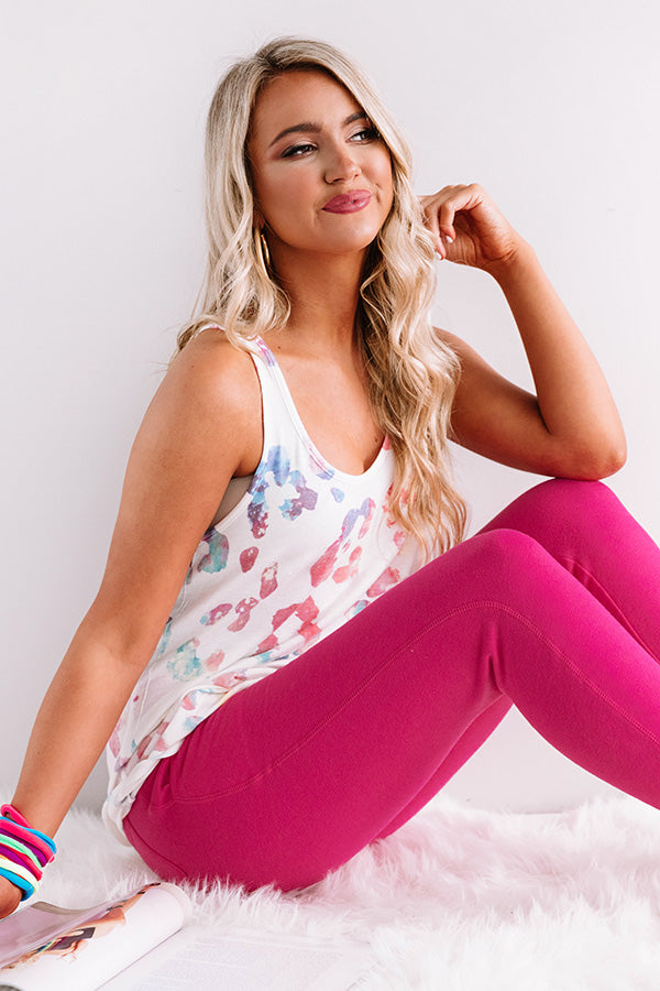 "Trust me" when I say that this tank is the cutest one yet! It features soft lightweight material patterned with a bold rainbow leopard print, a scooped neckline, 1-inch sleeveless shoulder straps with a racerback fit, and a relaxed silhouette that falls into a rounded hemline! We have styled this colorful piece with some matching joggers and hair ties, but you can also wear it with some distressed denim shorts, "The Lela Espadrille in White," our "Destination Dreaming Beaded Clutch!" Measurements