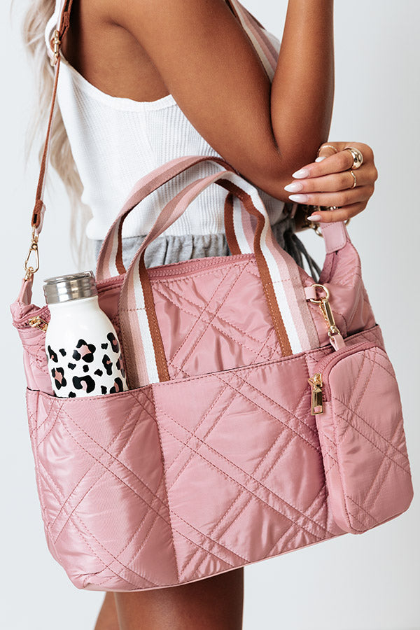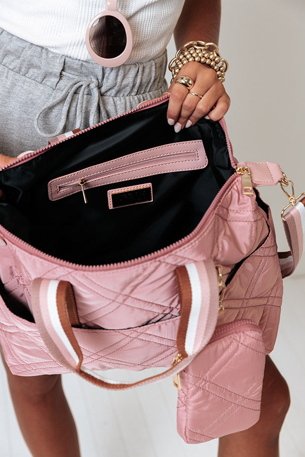 Whether you are headed to the gym or the airport, we have the perfect bag companion for you! Our pink 'Trust The Process' tote featuring lightweight material with quilted texturing, two striped tote handles and a striped removable and adjustable shoulder strap, side water bottle pouches, a removable zip closure cell phone pouch, and a spacious fully lined duffel silhouette with a zip closure and an additional inside pocket!