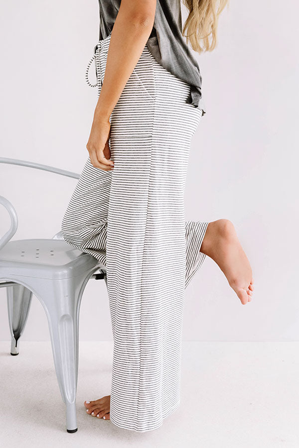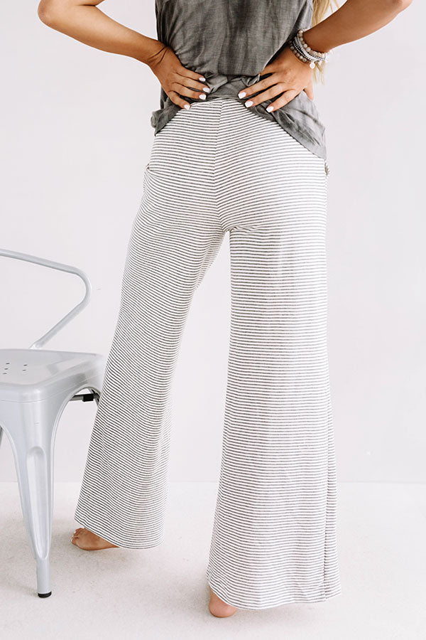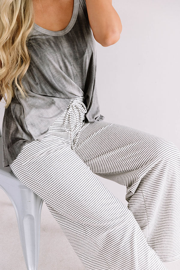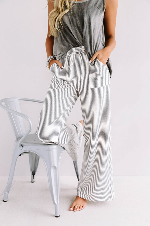 Truth...we are OBSESSED with these pants! They feature soft lightweight material patterned with horizontal black accent pin stripes, an elastic waistline with a tie closure, accent side pockets, and a relaxed silhouette that falls into flared floor-length hemlines! For the ultimate lounge look, we have styled these cuties with a basic grey tank, but for a more everyday look, they can be paired with a black bodysuit layered under a cropped jean jacket, "The Allen Wedge in Black," sunnies, and "The Real Deal Faux Leather Tote in Black!" Measurements