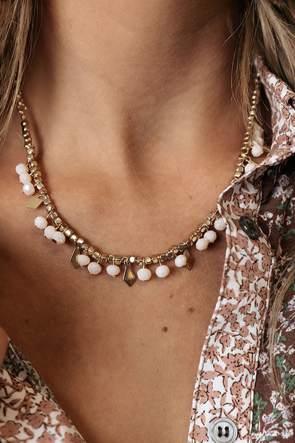 Upgrade your jewelry collection with our cute 'Tucked Away Necklace' featuring a gold chain with ivory colored bead charms and pointed gold charms!