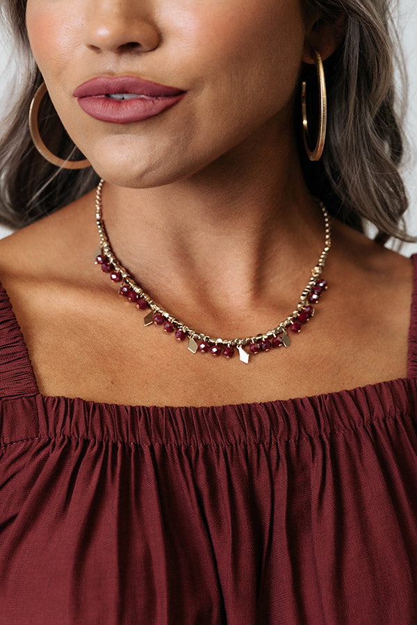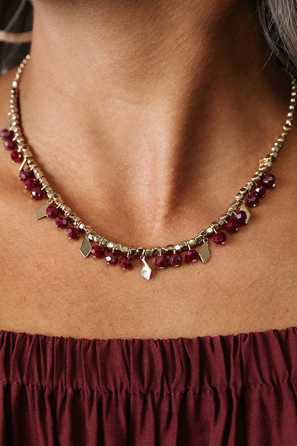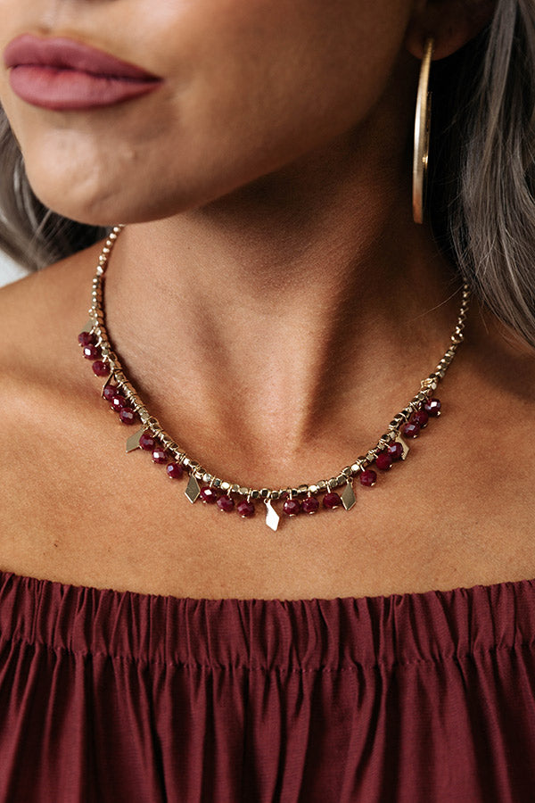 Upgrade your jewelry collection with our cute 'Tucked Away Necklace' featuring a gold chain with merlot colored bead charms and pointed gold charms!