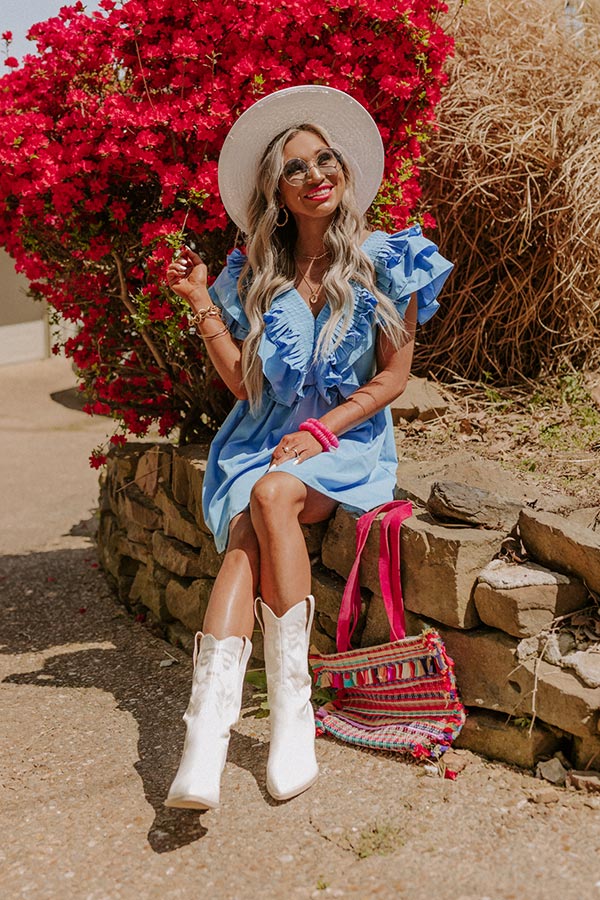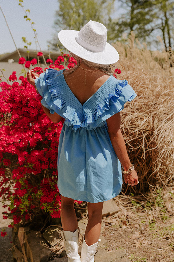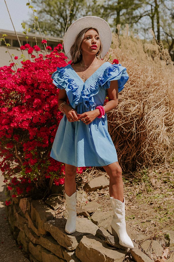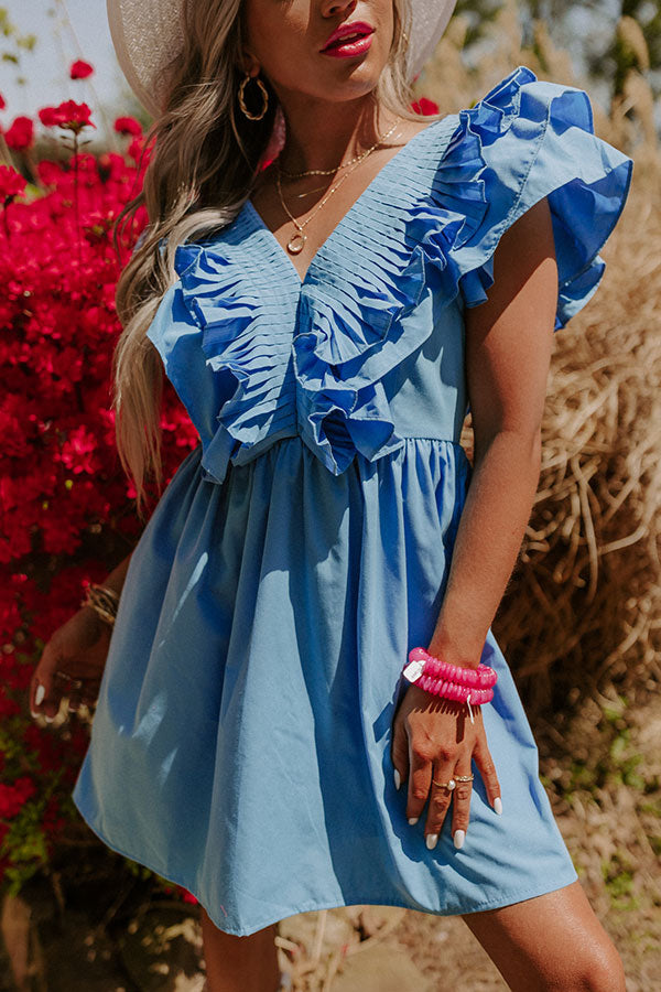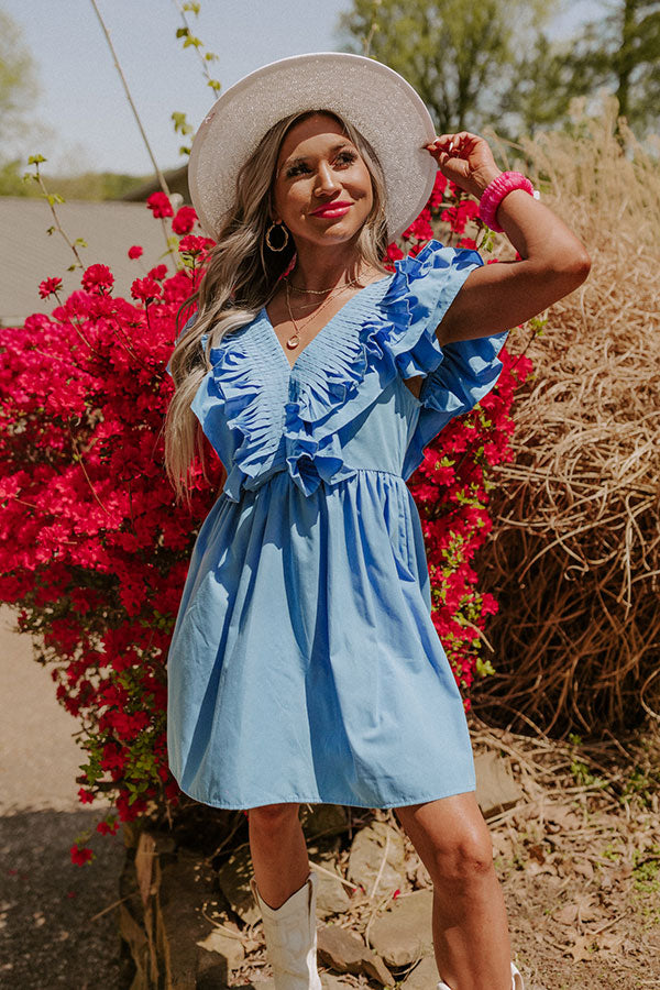 People are sure to make a toast to how amazing you look in this beautiful sky blue dress featuring lightweight material, a v-cut neckline and upper back, oversized pleated ruffle cap sleeves that continue down the bodice, and a relaxed skirt silhouette that falls into a straight mid-thigh length hemline! on products