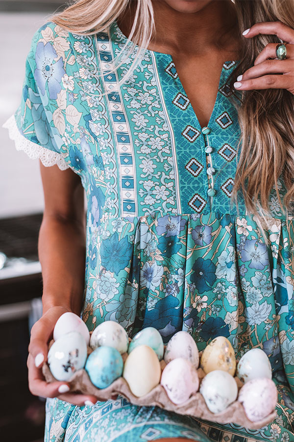 You surely be feeling all the spring vibes when you wear our darling turquoise "Tulum Treat" shift dress featuring lightweight breezy material patterned with a bold and colorful floral print, a button up bodice with a rounded hemline, short loose sleeves with intricate lace trim detailing, and an ultra relaxed silhouette that falls into an uneven knee-length hemline! This blossoming piece styles perfectly layered under a cropped denim jacket with "The Jess Fuax Leather Heel in Natural" and our "Golden Coast Woven Crossbody in Ivory!" Measurements