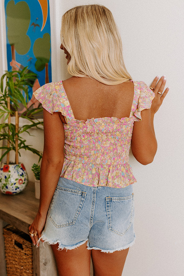 Slay all day in our cute 'Turn Away' top featuring smocked material patterned with a pretty pink floral print, a square neckline and upper back, ruffled cap sleeves, and a flattering fitted silhouette that ends in a straight ruffled hemline!