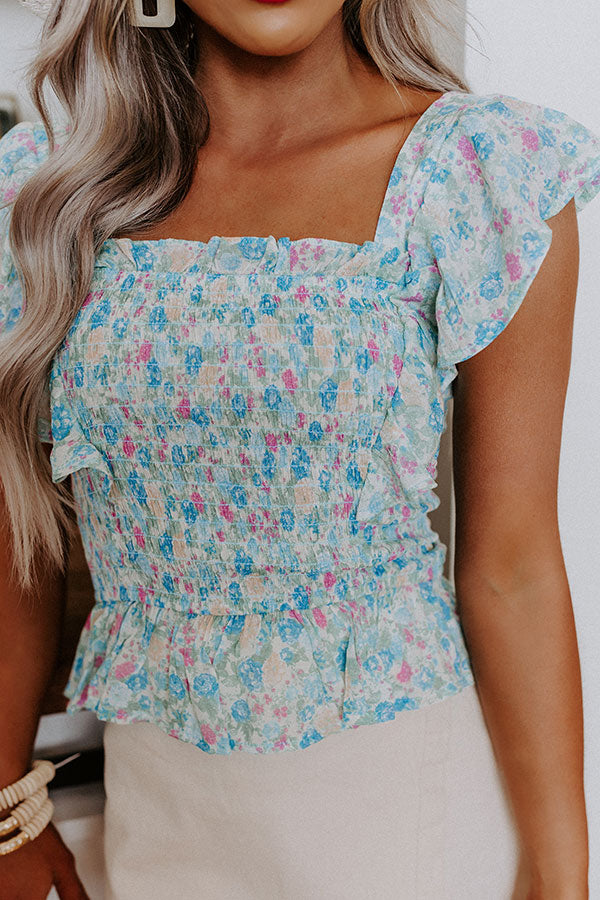 Turn Away Smocked Floral Top In Sky Blue