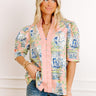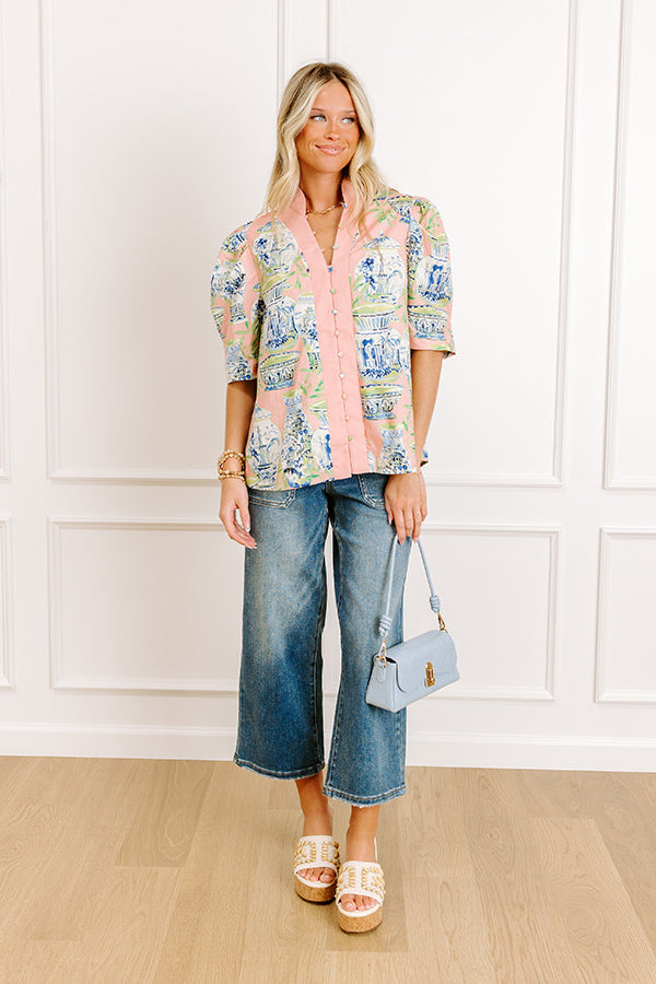 - Everyday outings feel extra charming in this pretty printed top. Featuring a playful pottery motif and buttoned front, it's made for strolls, sips, and style. - Unlined material with a pottery print featuring ivory and different shades of green and blue - A buttoned v-cut neckline - A buttons front - Short sleeves - A relaxed silhouette that ends in a straight hemline
