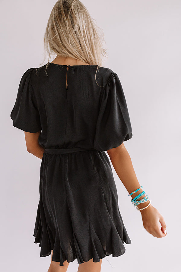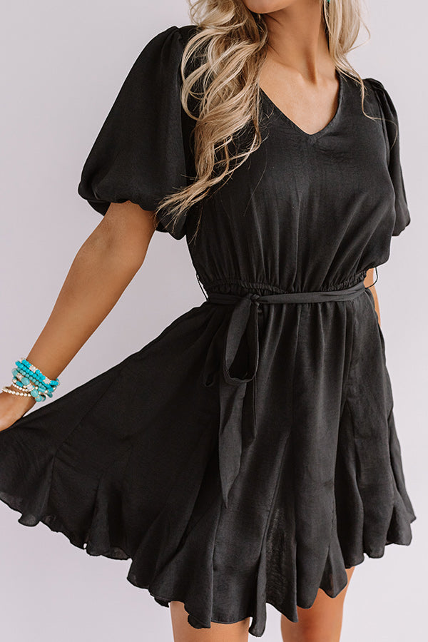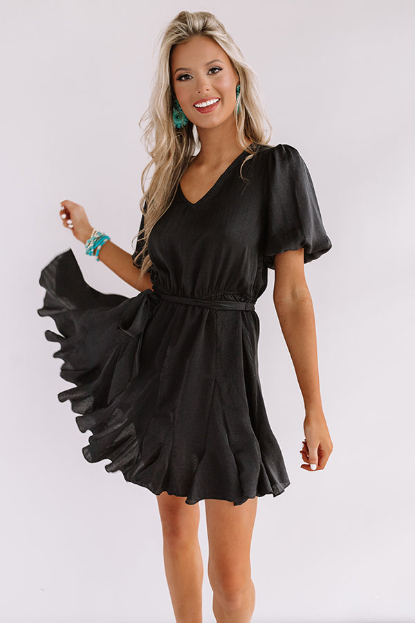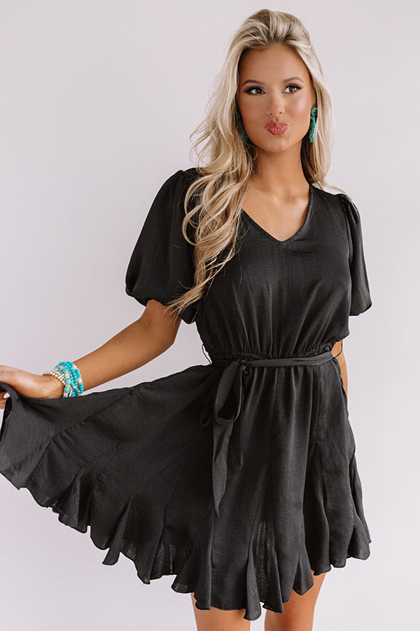 Be your own kind of beautiful in our stunning little black "Tuscan Twirls Dress" featuring sleek lightweight satin material, a v-cut neckline, short oversized bubble sleeves with elastic banded cuffs, a cinched waistband with a tie belt, a keyhole accented upper back with a button closure, and a relaxed silhouette that falls into an uneven mid-thigh length hemline with v-notched accent pleats! We have styled this classy piece with turquoise jewelry and leopard heels, but you can also wear it with "The Underwood Faux Leather Wedge in Blush" and our "Heart Of The City Faux Leather Clutch in Blush!" Measurements