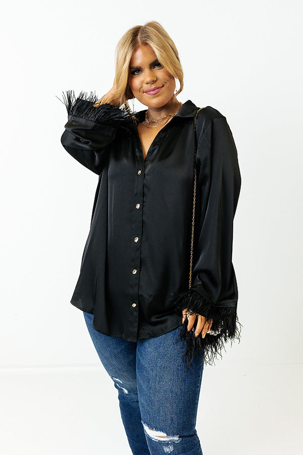 Office chic with a flirty flair, our trendy black colored 'Tuscan Vibes' top features sleek lightweight material, a button up front with a collared neckline, long loose sleeves with feather trim cuffs, and a relaxed silhouette that falls into a rounded hemline!