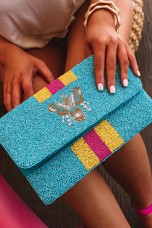 You will surely wow the crowd when you accessorize with our eye-catching "Tuscany For Two" clutch featuring blue beaded material with beaded fuchsia and yellow accent stripes and a beaded bee, a flap closure, and a spacious rectangular pouch!