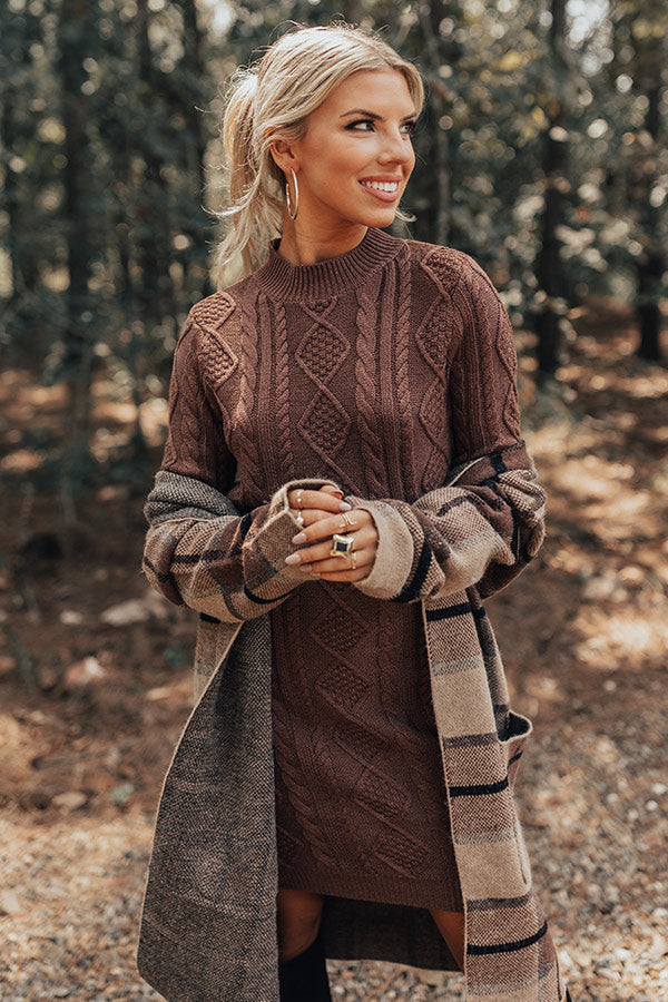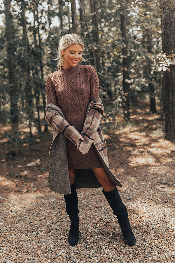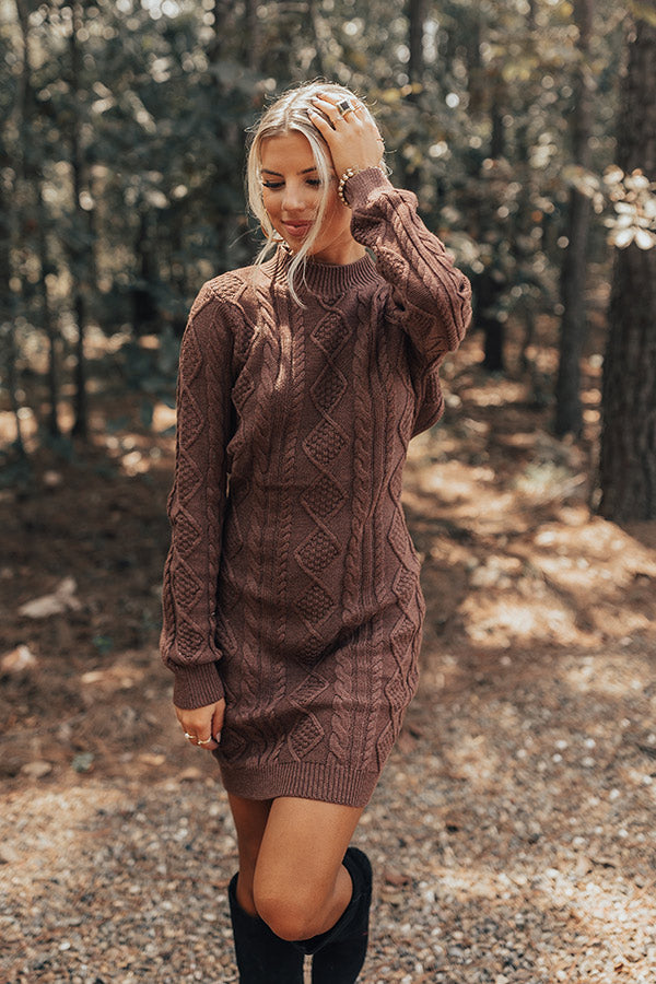 Spend your fall nights in style with this flirty chestnut colored sweater dress featuring soft cable knit material, a high neckline, long loose sleeves, a cutout back with a three button up closure, and a flattering figure hugging silhouette that falls into a straight mid-thigh length hemline! Measurements