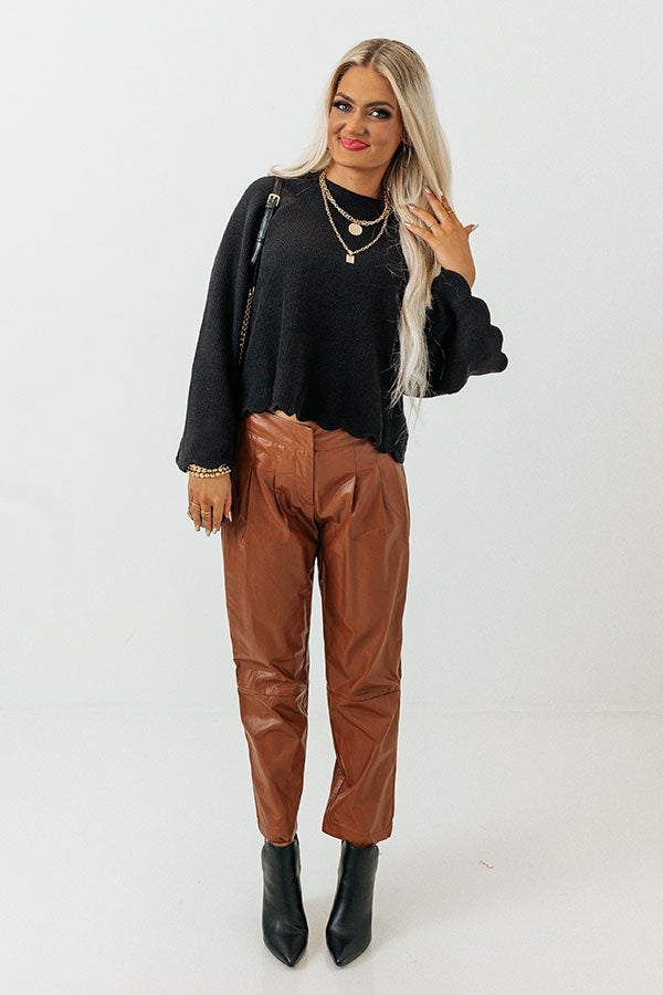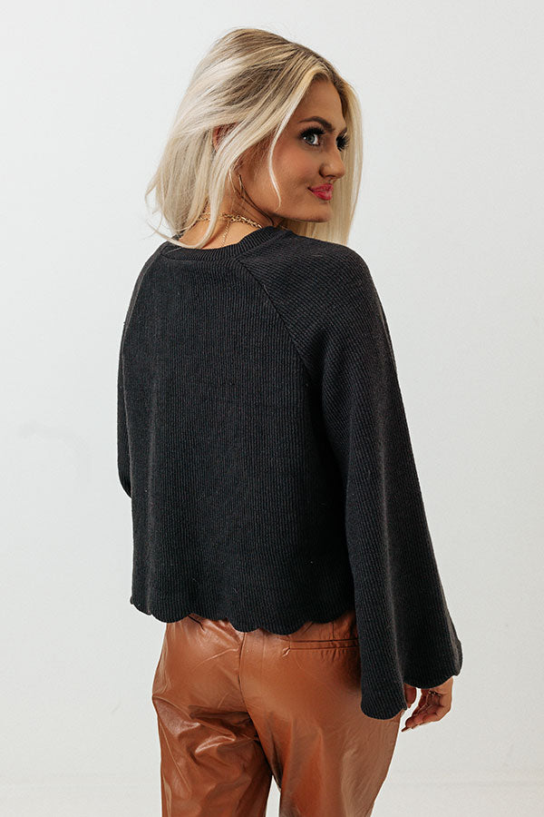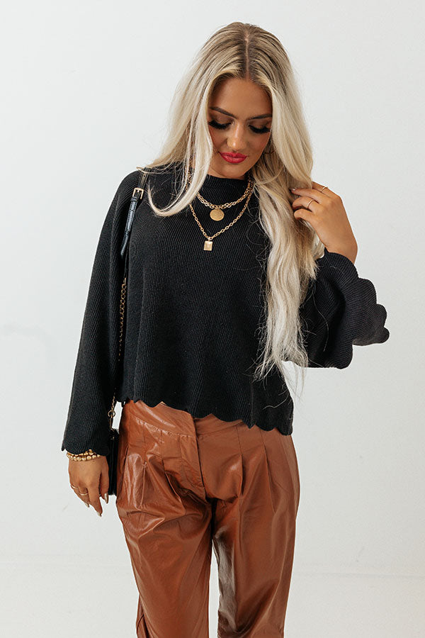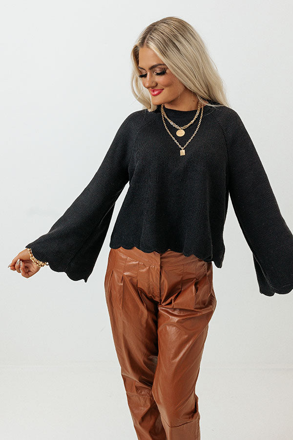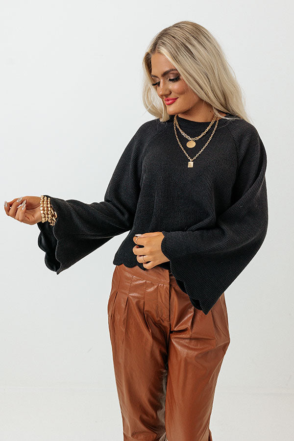 You are sure to look "twice as nice" when you wear this adorable little black shift sweater featuring lightweight material with ribbed texturing, a high rounded neckline, long loose sleeves with ultra flared cuffs, scalloped trim detailing, and a relaxed silhouette that falls into an uneven hemline! This simple but significant transitional piece can be styled a variety of ways, like with some oversized red flares, black booties, and a snake print tote, or you can wear it with some distressed ankle skinnies, "The Seraphina Faux Leather Heel in Grey," and our "Bold Ambition Knit Hat in Grey!"