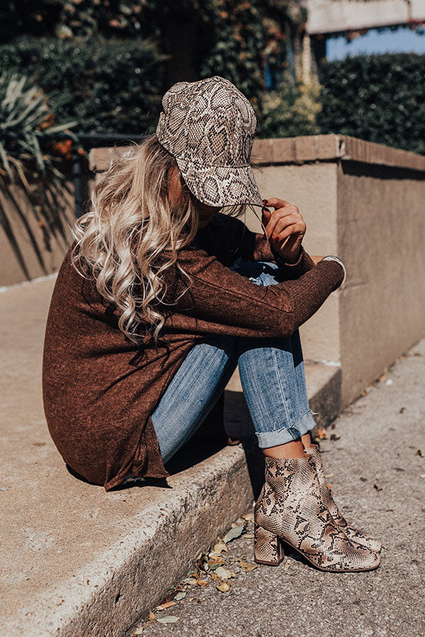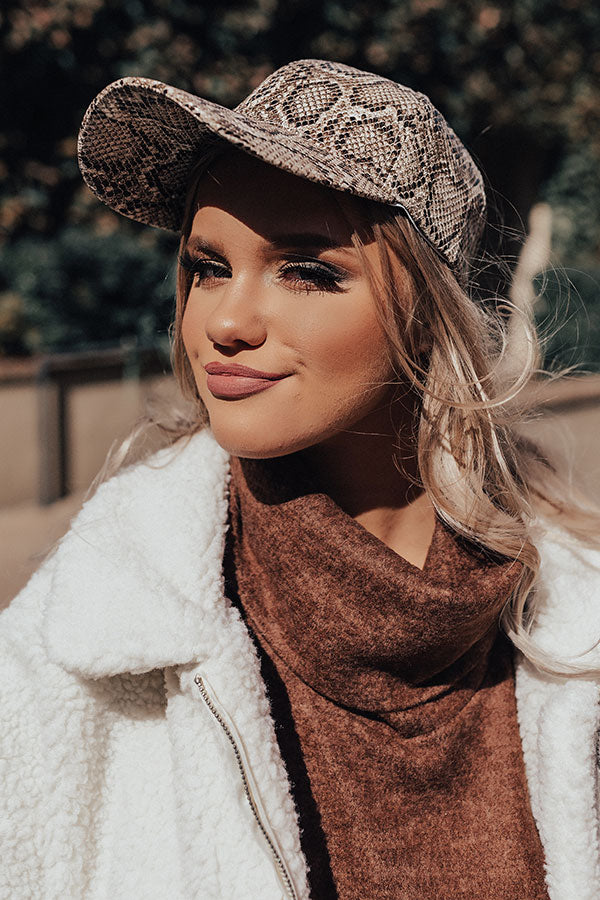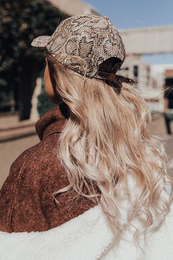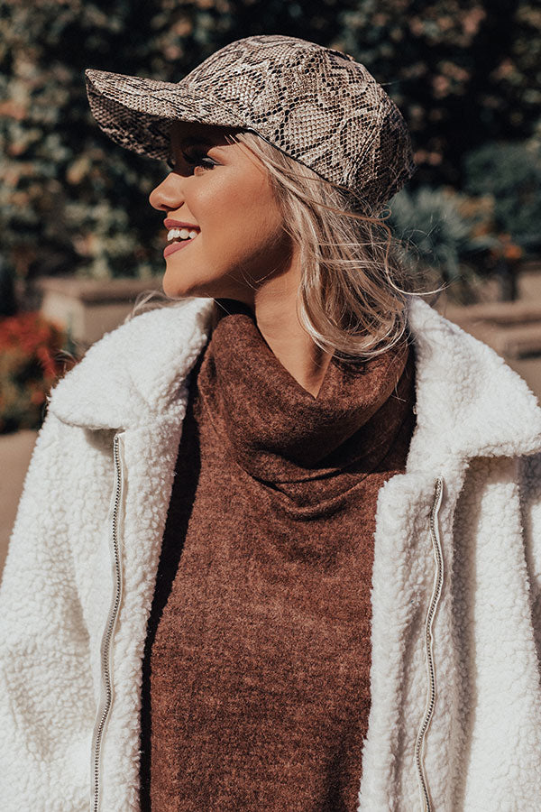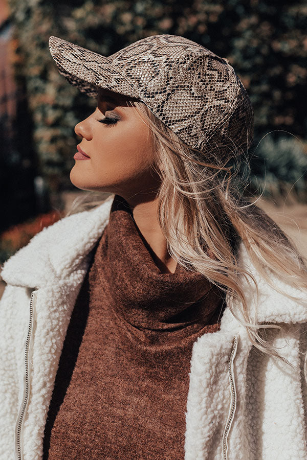 There is no better way to make an "ultimate comeback" than with this striking baseball cap featuring sleek faux leather material patterned with a brown and neutral snake print and a curved bill!
