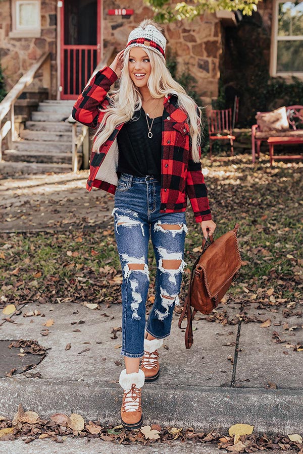 We have no doubt you will feel the 'ultimate comfort' when keeping warm with this festive jacket featuring thick material patterned with a black and red buffalo check print, an ultra soft sherpa lining, long loose sleeves with snap button closure cuffs, accent side pockets and chest pockets with flap closures, a button down front with a collared neckline, and a flattering silhouette that ends in a straight hemline! Measurements