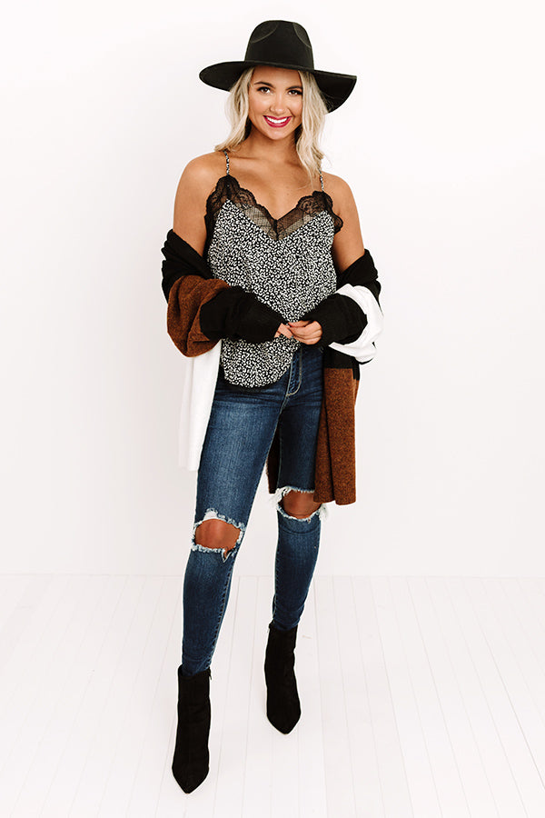 The ultimate fall layering piece just dropped! Our flirty black 'Girl Next Door' tank features sleek lightweight material patterned with a white leopard print, a v-cut neckline with intricate black lace trim detailing, adjustable spaghetti straps, and a flowy silhouette that falls into a rounded hemline!