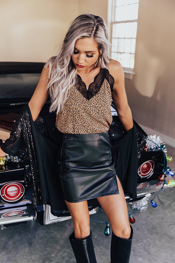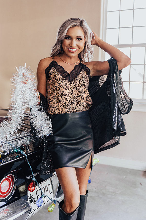 The ultimate fall layering piece just dropped! Our flirty iced mocha colored 'Girl Next Door' tank features sleek lightweight material patterned with a black leopard print, a v-cut neckline with intricate black lace trim detailing, adjustable spaghetti straps, and a flowy silhouette that falls into a rounded hemline!