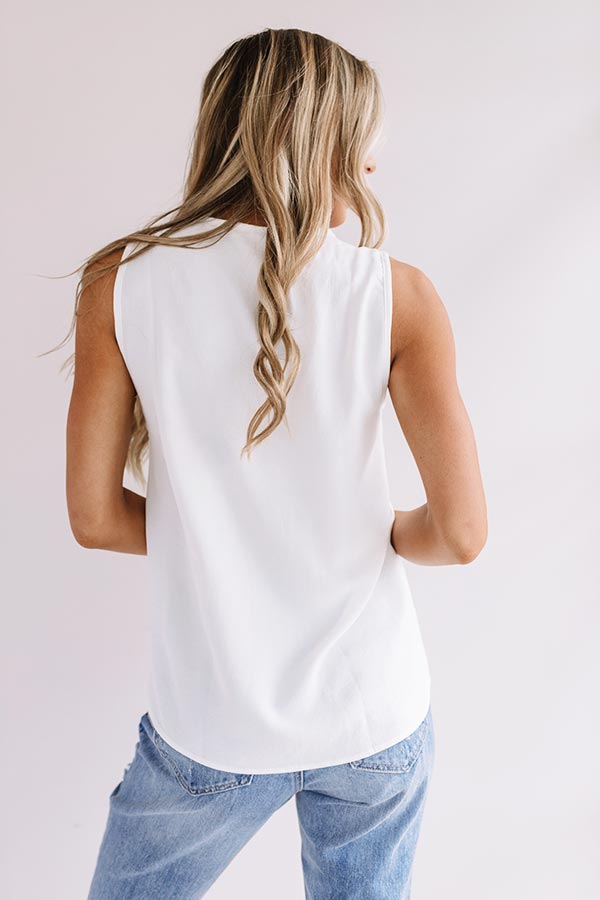 This white shift tank features an uneven hem and a v-neck making this top the perfect breezy summer piece! Style with some distressed white skinny jeans and eye catching earrings and you'll have the ideal outfit for those moonlight hangouts under the boardwalk! Measurements