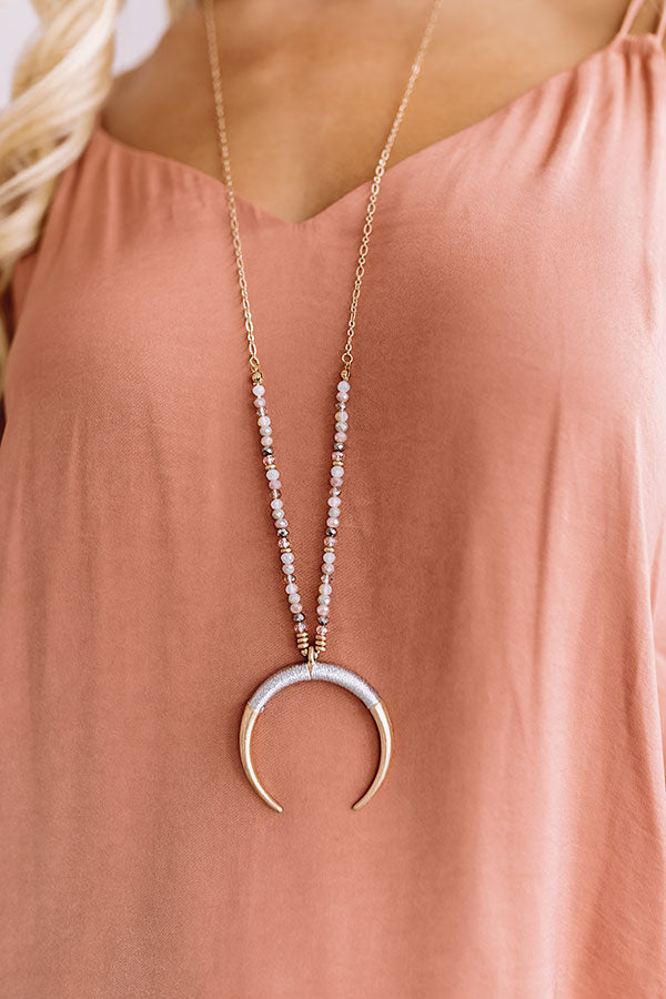 You will look stunning "under the moonlight" when you accessorize with this statement necklace featuring a long dainty gold chain with grey beads and a large crescent moon pendant!