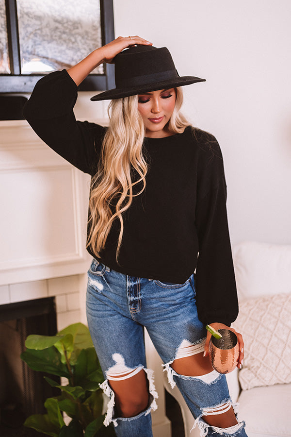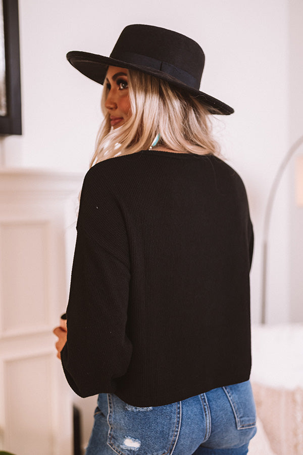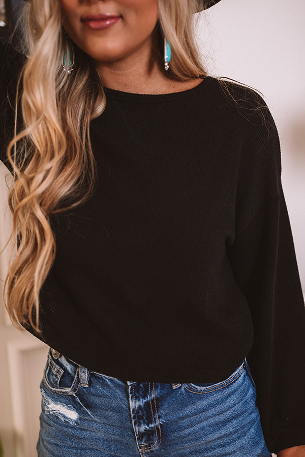 Upgrade your fall basic with our black "Under The Oak Tree" top featuring soft lightweight tight knit material with subtle ribbed texturing, a high rounded neckline, long loose sleeves, and a relaxed silhouette that falls into a straight cropped hemline! This casual cutie can be styled a variety of ways, like with some ultra distressed jeans, snake print boots, and a matching wool hat, but you can also wear it with our "Neutral Necessity Skirt in White," "The Cassandra Bootie in Black," and our white "Just Add Cocktails Beaded Clutch!" Measurements