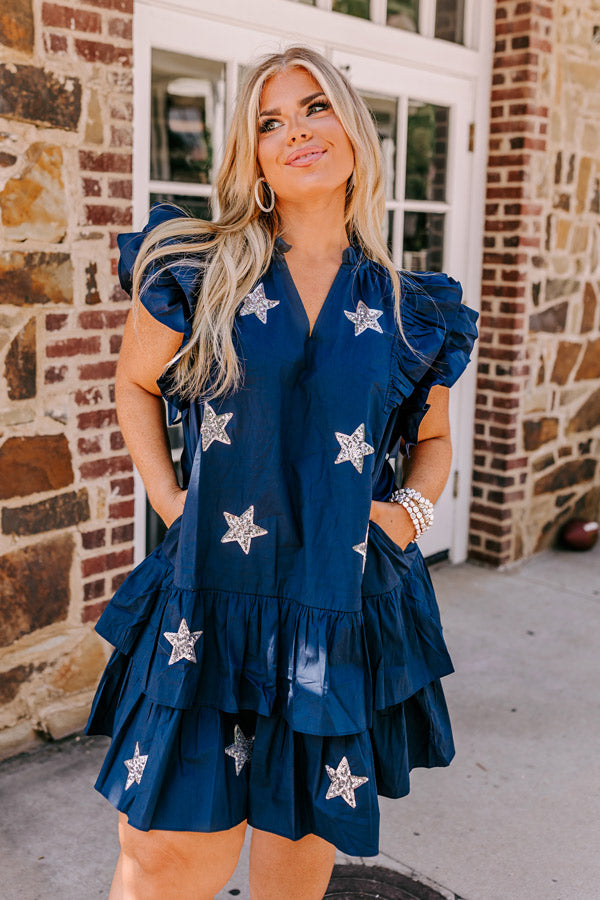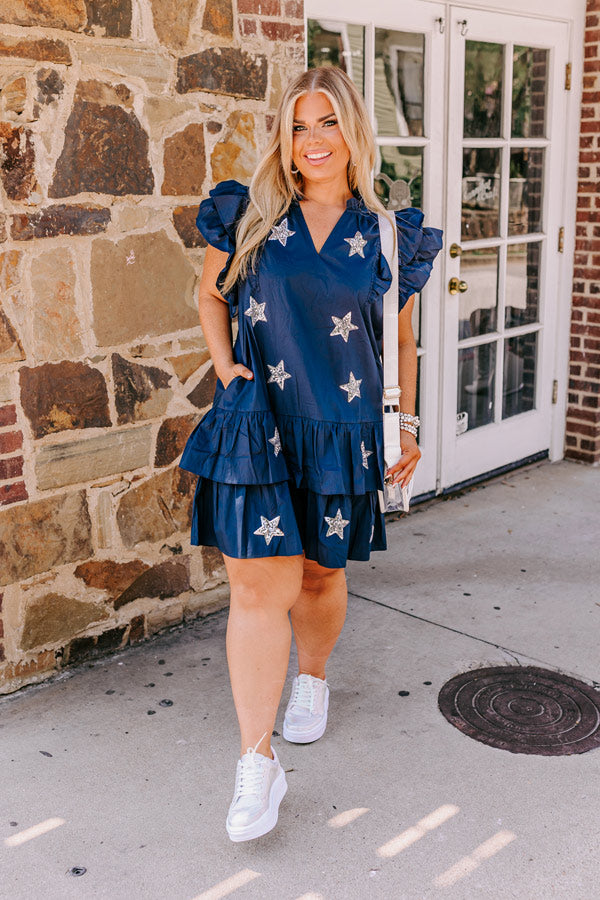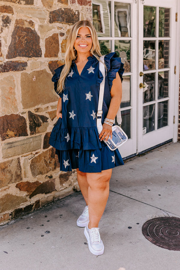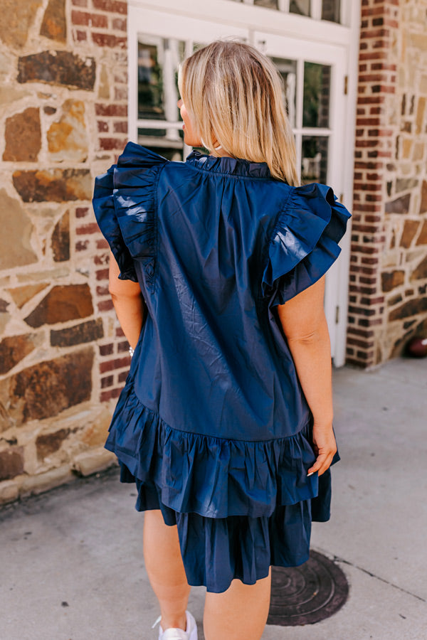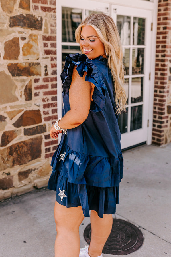 Under The Stadium Lights Ruffle Mini Dress in Navy Curves