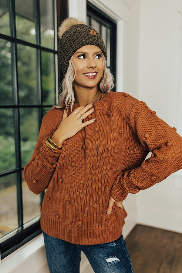 Get ready for sweater weather with our adorable rust colored 'Undercover Sweetness' top featuring ultra sot lightweight tight knit material with pom pom accents, a high rounded neckline, long loose sleeves with fitted cuffs, ribbed trim detailing, and a relaxed silhouette that falls into a straight hemline!