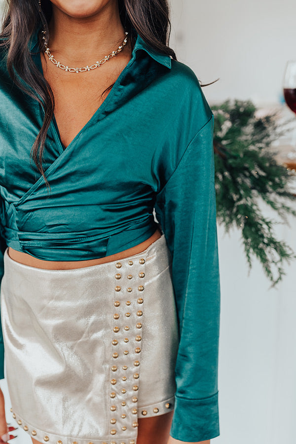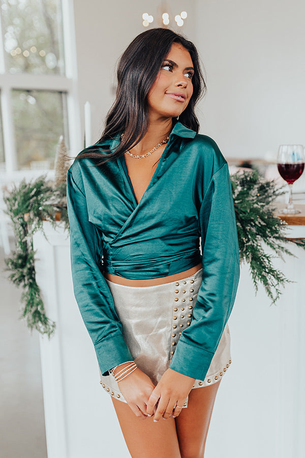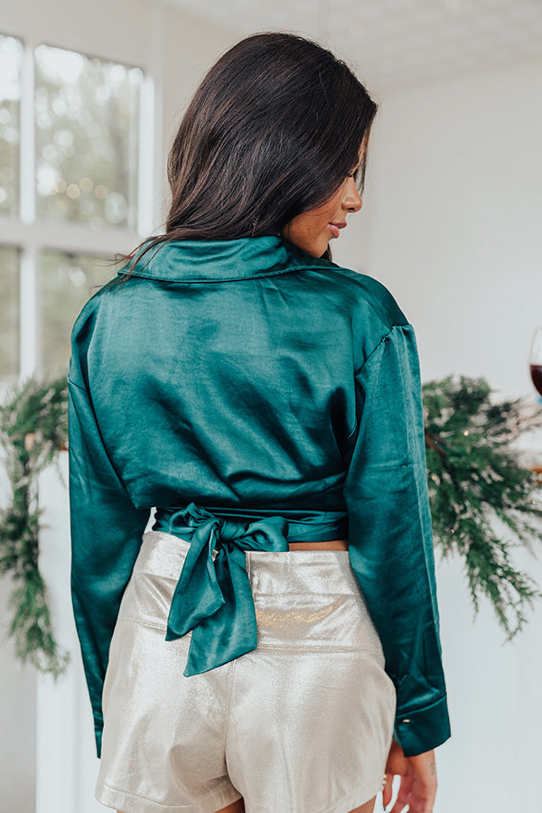 You are sure to wow the crowd when you arrive in our flirty hunter green colored 'Unseen Beauty' top featuring lightweight satin material, a collared deep v-cut neckline, long loose sleeves with button closure cuffs, and a flattering silhouette that ends in a twisted front hemline that ties in the back!