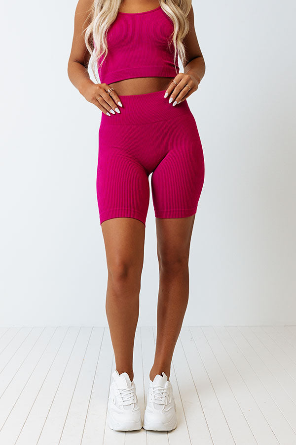 Add a pop of color to your athleisure wardrobe with our cute berry colored 'Up At Dawn' bike shorts featuring lightweight four-way stretch material with subtle vertical ribbed texturing, a high waistline, and a flattering figure hugging silhouette that ends in straight mid-thigh length hemlines! on products